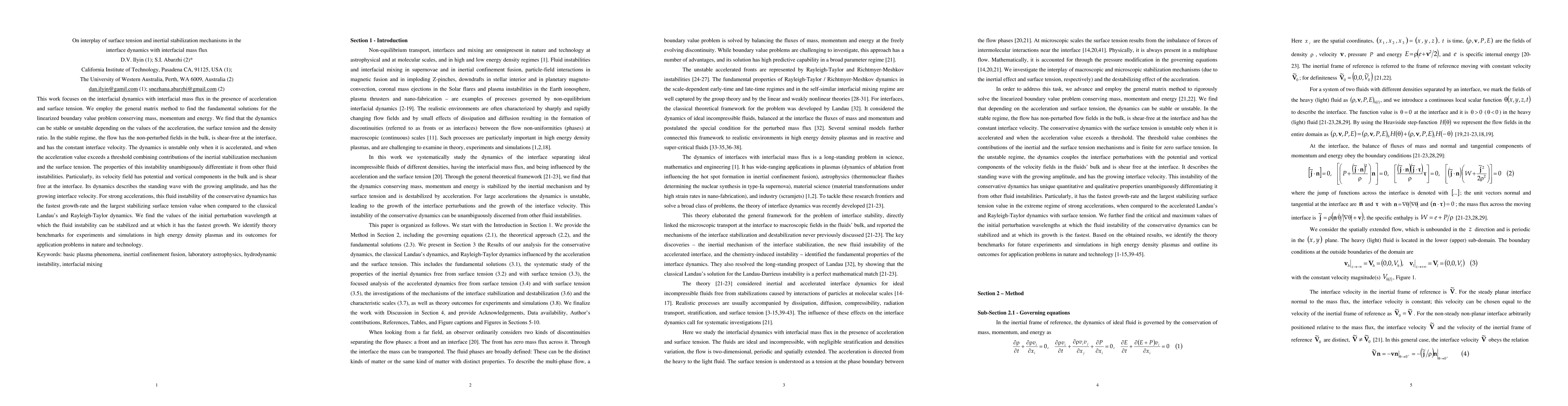 This work focuses on the interfacial dynamics with interfacial mass flux in the presence of acceleration and surface tension. We employ the general matrix method to find the fundamental solutions for the linearized boundary value problem conserving mass, momentum and energy. We find that the dynamics can be stable or unstable depending on the values of the acceleration, the surface tension and the density ratio. In the stable regime, the flow has the non-perturbed fields in the bulk, is shear-free at the interface, and has the constant interface velocity. The dynamics is unstable only when it is accelerated, and when the acceleration value exceeds a threshold combining contributions of the inertial stabilization mechanism and the surface tension. The properties of this instability unambiguously differentiate it from other fluid instabilities. Particularly, its velocity field has potential and vortical components in the bulk and is shear free at the interface. Its dynamics describes the standing wave with the growing amplitude, and has the growing interface velocity. For strong accelerations, this fluid instability of the conservative dynamics has the fastest growth-rate and the largest stabilizing surface tension value when compared to the classical Landau and Rayleigh-Taylor dynamics. We find the values of the initial perturbation wavelength at which the fluid instability can be stabilized and at which it has the fastest growth. We identify theory benchmarks for experiments and simulations in high energy density plasmas and its outcomes for application problems in nature and technology.