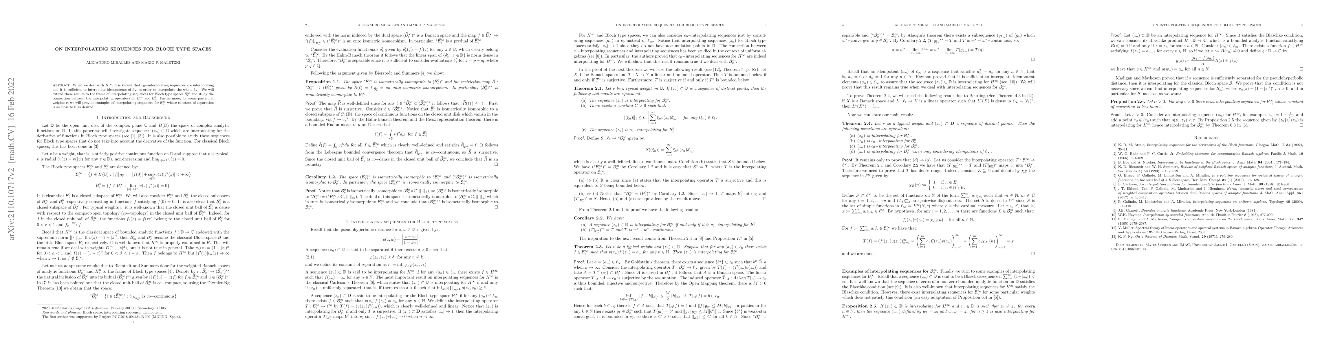 When we deal with $H^{\infty}$, it is known that $c_0-$interpolating sequences are interpolating and it is sufficient to interpolate idempotents of $\ell_\infty$ in order to interpolate the whole $\ell_\infty$. We will extend these results to the frame of interpolating sequences for Bloch type spaces $\mathcal{B}_{v}^\infty$ and study the connection between the interpolating operators on $\mathcal{B}_{v}^\infty$ and $\mathcal{B}_v^0$. Furthermore, for some particular weights $v$, we will provide examples of interpolating sequences for $\mathcal{B}_{v}^\infty$ whose constant of separation is as close to 0 as desired.