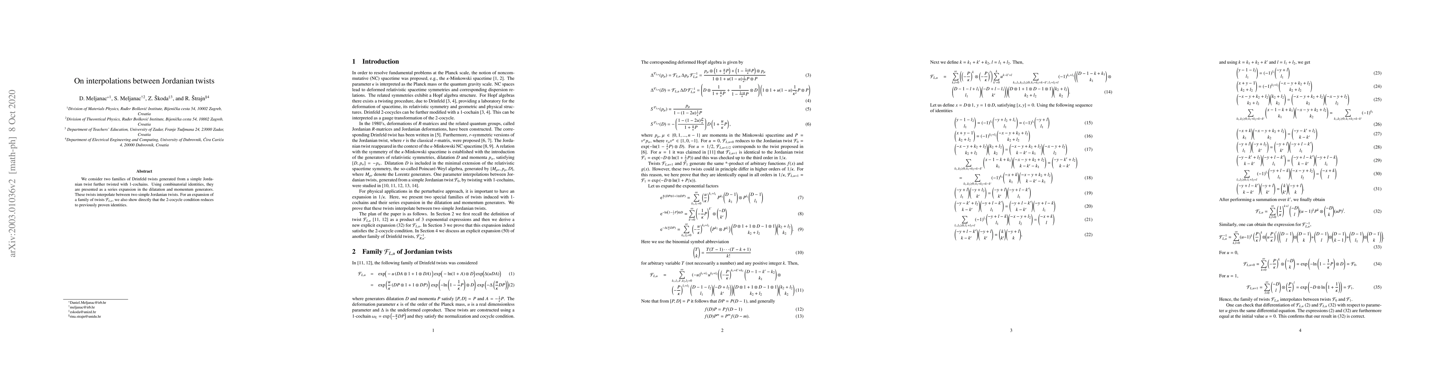 This paper explores two families of Drinfeld twists derived from a simple Jordanian twist, expressed as series expansions involving dilatation and momentum generators. It demonstrates that these twists interpolate between two simple Jordanian twists and verifies that the 2-cocycle condition simplifies to previously established identities for the twist family $\mathcal{F}_{L,u}$.