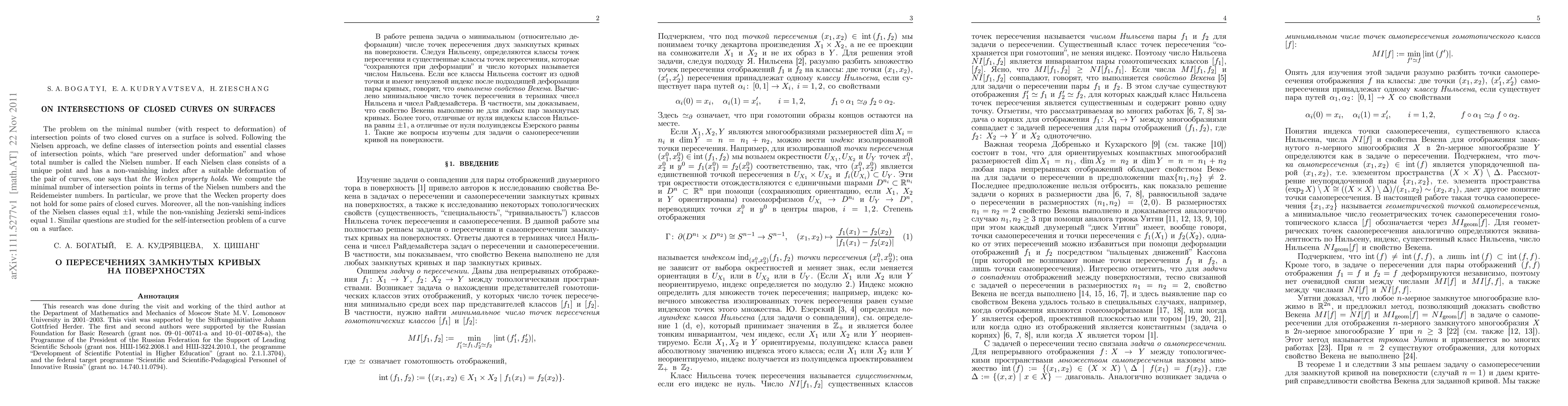 This paper solves the problem of finding the minimal number of intersection points between two closed curves on a surface, using Nielsen's approach to define intersection classes preserved under deformation. It proves that the Wecken property does not hold for some pairs of curves, and that the non-vanishing indices of the Nielsen classes are $\pm1$.