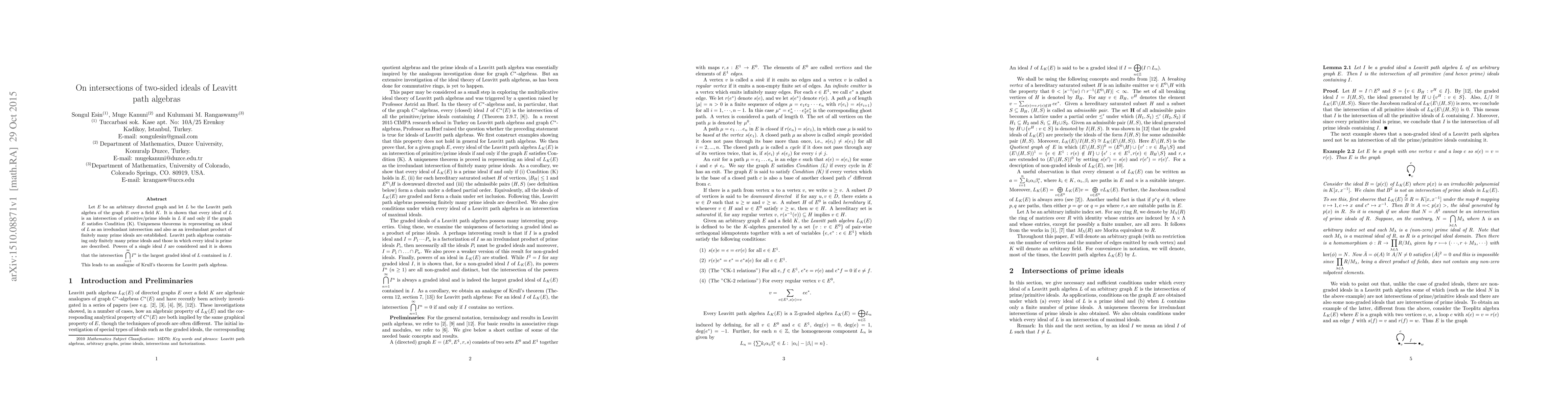 This paper investigates the structure of ideals in Leavitt path algebras associated with directed graphs, proving that every ideal can be expressed as an intersection of prime ideals if the graph satisfies Condition (K). It also establishes the uniqueness of such representations and explores the algebraic properties of these algebras, including the behavior of powers of ideals and an analogue of Krull's theorem.
