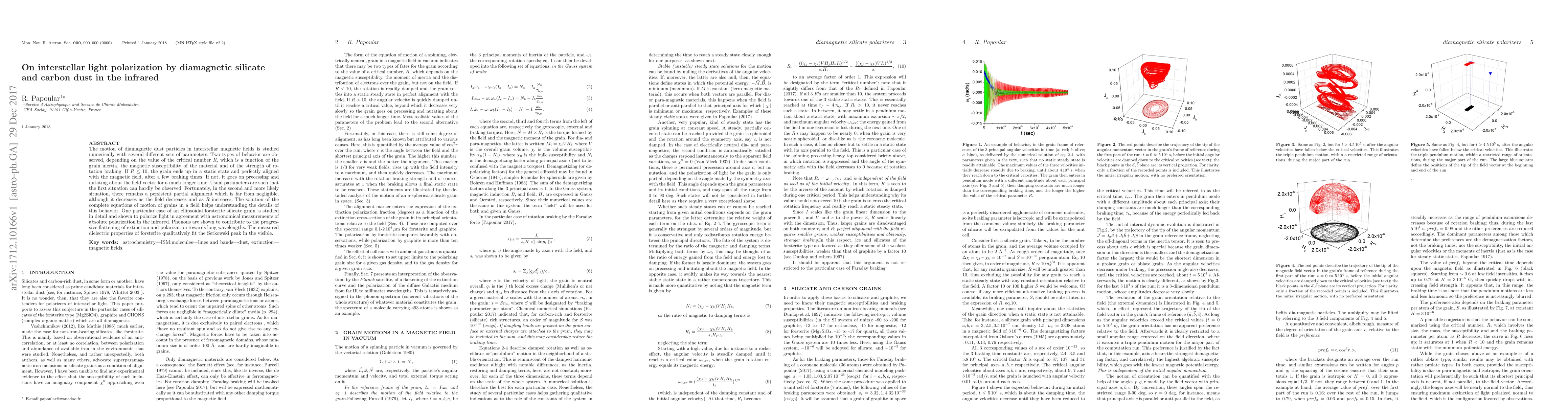 The motion of diamagnetic dust particles in interstellar magnetic fields is studied numerically with several different sets of parameters. Two types of behavior are observed, depending on the value of the critical number $R$, which is a function of the grain inertia, the magnetic susceptibility of the material and of the strength of rotation braking. If $R\leq10$, the grain ends up in a static state and perfectly aligned with the magnetic field, after a few braking times. If not, it goes on precessing and nutating about the field vector for a much longer time. Usual parameters are such that the first situation can hardly be observed. Fortunately, in the second and more likely situation, there remains a persistent partial alignment which is far from negligible, although it decreases as the field decreases and as $R$ increases. The solution of the complete equations of motion of grains in a field helps understanding the details of this behavior. One particular case of an ellipsoidal forsterite silicate grain is studied in detail and shown to polarize light in agreement with astronomical measurements of absolute polarization in the infrared. Phonons are shown to contribute to the progressive flattening of extinction and polarization towards long wavelengths. The measured dielectric properties of forsterite qualitatively fit the Serkowski peak in the visible.