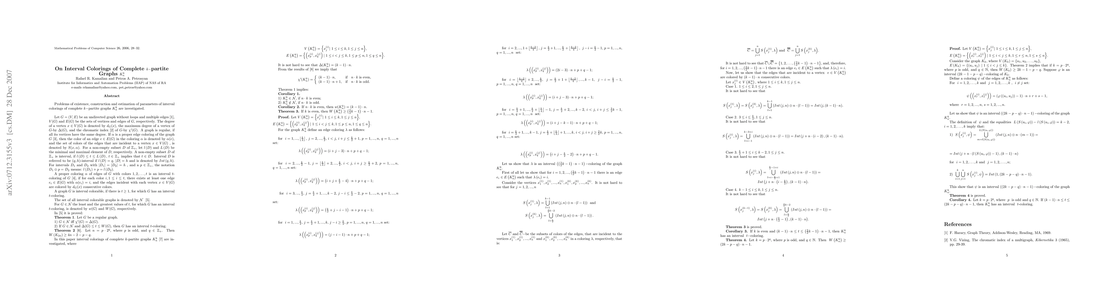 Summary: This paper explores the existence, construction, and parameter estimation of interval colorings for complete k-partite graphs K_{n}^{k}. It delves into the intricate details of how these graphs can be colored within specified intervals.