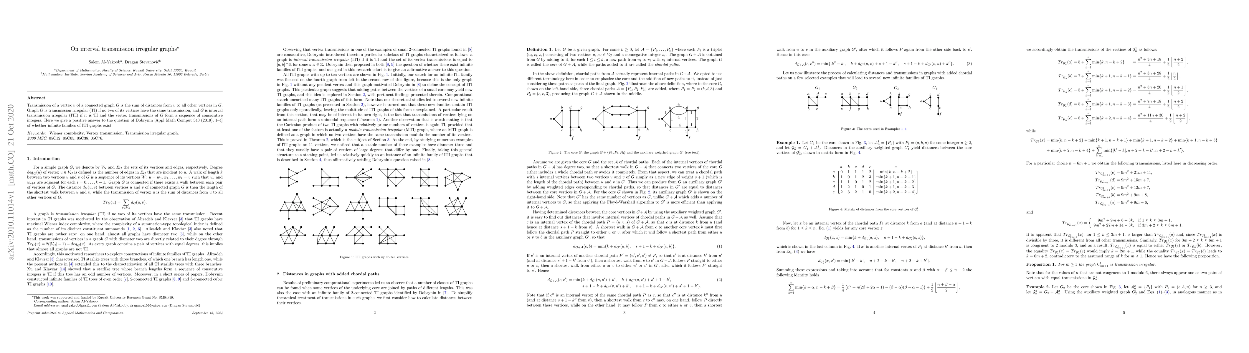 The paper introduces the Dobrynin graph Dobk and proves its interval transmission irregularity for all k ≥ 1, alongside methods for generating and analyzing ITI graphs.