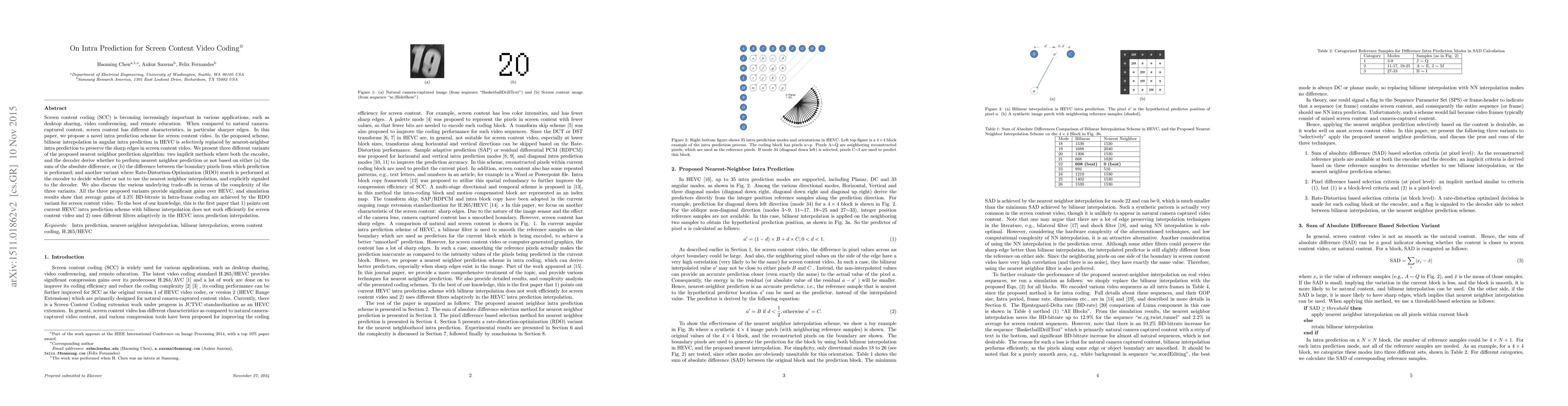 This paper proposes a novel intra prediction scheme for screen content video in HEVC, replacing bilinear interpolation with nearest-neighbor interpolation to better preserve sharp edges. Three variants of the scheme are presented, showing significant gains over HEVC, with the RDO variant achieving an average 3.3% BD-bitrate reduction.