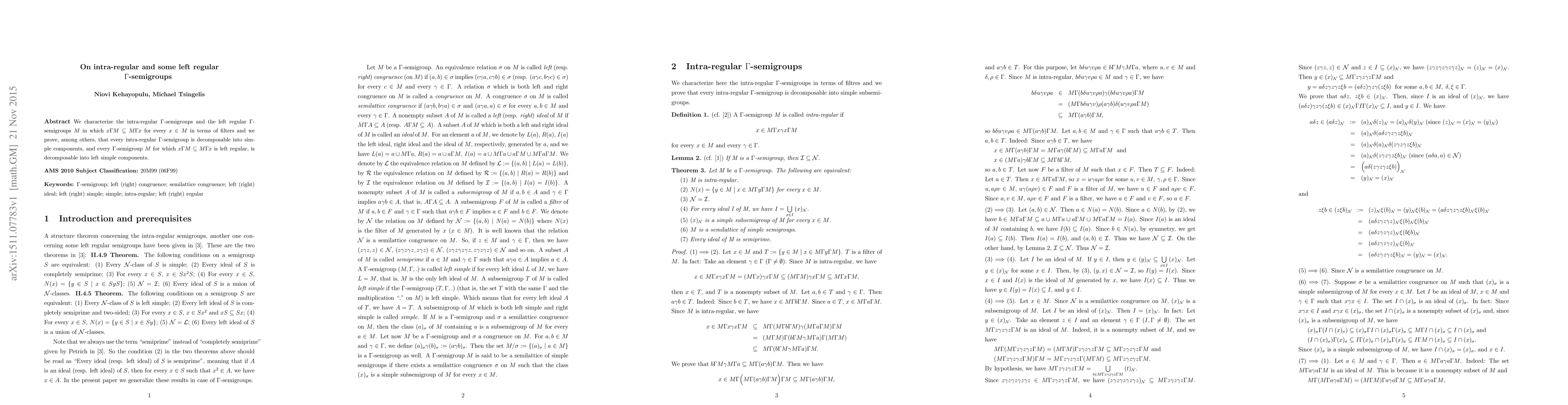 We characterize the intra-regular $\Gamma$-semigroups and the left regular $\Gamma$-semigroups $M$ in which $x\Gamma M\subseteq M\Gamma x$ for every $x\in M$ in terms of filters and we prove, among others, that every intra-regular $\Gamma$-semigroup is decomposable into simple components, and every $\Gamma$-semigroup $M$ for which $x\Gamma M\subseteq M\Gamma x$ is left regular, is decomposable into left simple components.