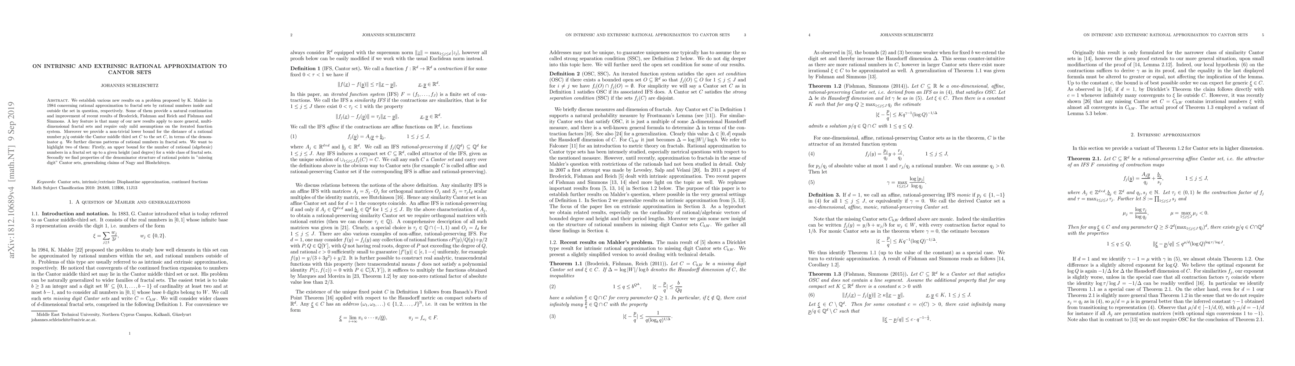 This paper presents new results on rational approximation to Cantor sets, both inside and outside, extending Mahler's 1984 problem. It provides upper bounds for rational numbers in fractal sets and explores the denominator structure of rational points in "missing digit" Cantor sets, offering a non-trivial lower bound for distances from rational numbers outside the Cantor set.