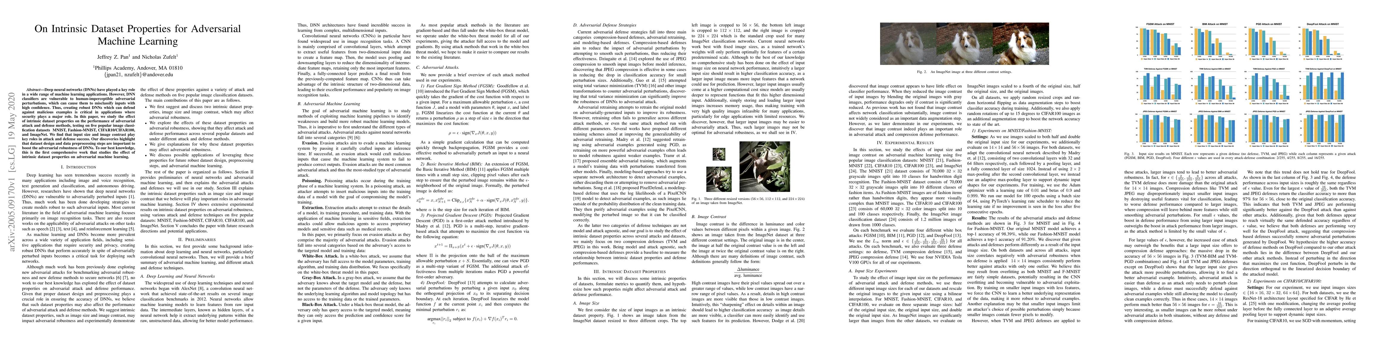 Deep neural networks (DNNs) have played a key role in a wide range of machine learning applications. However, DNN classifiers are vulnerable to human-imperceptible adversarial perturbations, which can cause them to misclassify inputs with high confidence. Thus, creating robust DNNs which can defend against malicious examples is critical in applications where security plays a major role. In this paper, we study the effect of intrinsic dataset properties on the performance of adversarial attack and defense methods, testing on five popular image classification datasets - MNIST, Fashion-MNIST, CIFAR10/CIFAR100, and ImageNet. We find that input size and image contrast play key roles in attack and defense success. Our discoveries highlight that dataset design and data preprocessing steps are important to boost the adversarial robustness of DNNs. To our best knowledge, this is the first comprehensive work that studies the effect of intrinsic dataset properties on adversarial machine learning.