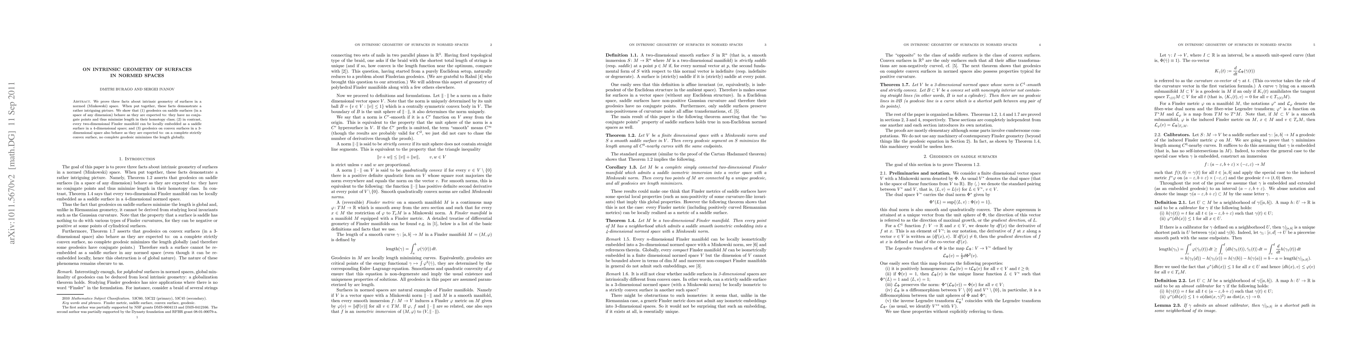 We prove three facts about intrinsic geometry of surfaces in a normed (Minkowski) space. When put together, these facts demonstrate a rather intriguing picture. We show that (1) geodesics on saddle surfaces (in a space of any dimension) behave as they are expected to: they have no conjugate points and thus minimize length in their homotopy class; (2) in contrast, every two-dimensional Finsler manifold can be locally embedded as a saddle surface in a 4-dimensional space; and (3) geodesics on convex surfaces in a 3-dimensional space also behave as they are expected to: on a complete strictly convex surface, no complete geodesic minimizes the length globally.