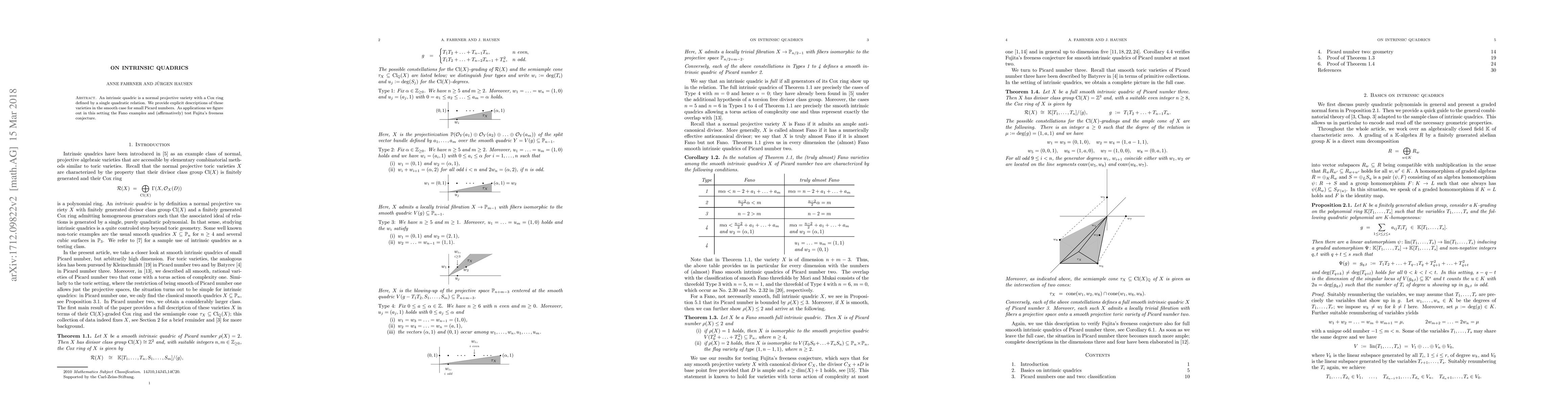 An intrinsic quadric is a normal projective variety with a Cox ring defined by a single quadratic relation. We provide explicit descriptions of these varieties in the smooth case for small Picard numbers. As applications, we figure out in this setting the Fano examples and (affirmatively) test Fujita's base point free conjecture.
