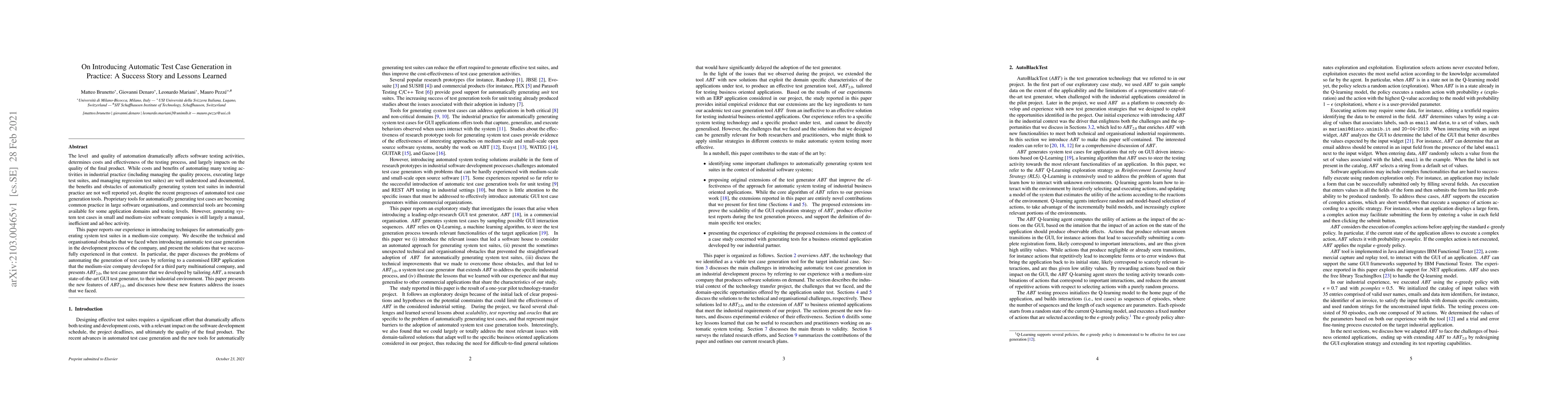 This paper details a medium-size company's successful implementation of automatic test case generation for a customised ERP application, highlighting technical and organizational challenges and solutions, including the development of a tailored test case generator, ABT2.0, which addresses specific industrial context issues.