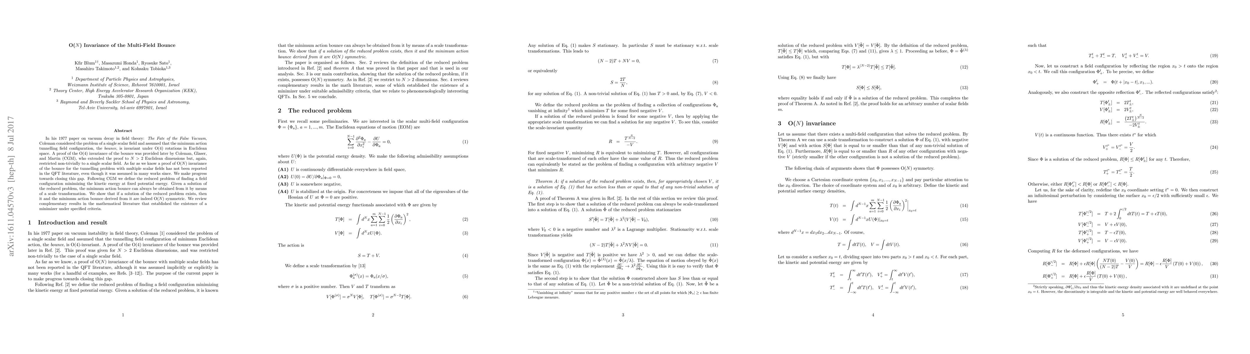 In his 1977 paper on vacuum decay in field theory: The Fate of the False Vacuum, Coleman considered the problem of a single scalar field and assumed that the minimum action tunnelling field configuration, the bounce, is invariant under O(4) rotations in Euclidean space. A proof of the O(4) invariance of the bounce was provided later by Coleman, Glaser, and Martin (CGM), who extended the proof to $N>2$ Euclidean dimensions but, again, restricted non-trivially to a single scalar field. As far as we know a proof of O($N$) invariance of the bounce for the tunnelling problem with multiple scalar fields has not been reported, even though it was assumed in many works since, being of phenomenological interest. We make progress towards closing this gap. Following CGM we define the reduced problem of finding a field configuration minimizing the kinetic energy at fixed potential energy. Given a solution of the reduced problem, the minimum action bounce can always be obtained from it by means of a scale transformation. We show that if a solution of the reduced problem exists, then it and the minimum action bounce derived from it are indeed O($N$) symmetric.