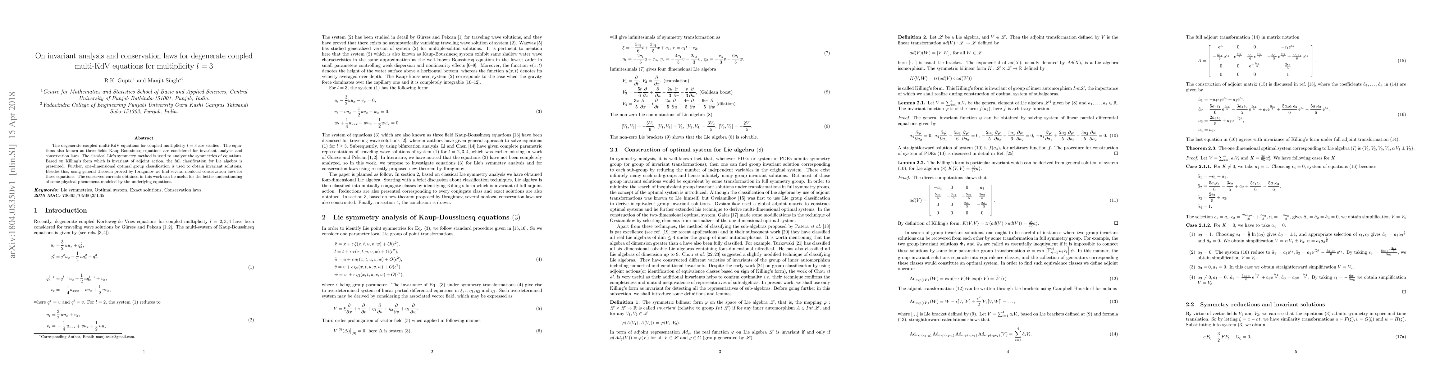 The degenerate coupled multi-KdV equations for coupled multiplicity l=3 are studied. The equations also known as three fields Kaup-Boussinesq equations are considered for invariant analysis and conservation laws. The classical Lie's symmetry method is used to analyze the symmetries of equations. Based on Killing's form which is invariant of adjoint action, the full classification for Lie algebra is presented. Further, one-dimensional optimal group classification is used to obtain invariant solutions. Besides this, using general theorem proved by Ibragimov we find several nonlocal conservation laws for these equations. The conserved currents obtained in this work can be useful for the better understanding of some physical phenomena modeled by the underlying equations.