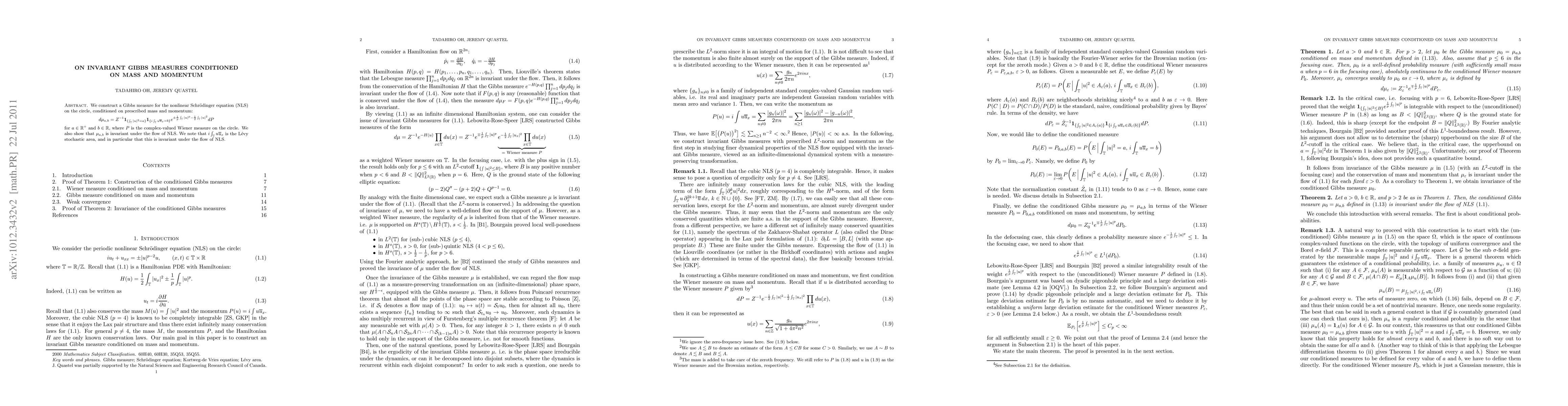 We construct a Gibbs measure for the nonlinear Schrodinger equation (NLS) on the circle, conditioned on prescribed mass and momentum: d \mu_{a,b} = Z^{-1} 1_{\int_T |u|^2 = a} 1_{i \int_T u \bar{u}_x = b} exp (\pm1/p \int_T |u|^p - 1/2 \int_{\T} |u|^2) d P for a \in R^+ and b \in R, where P is the complex-valued Wiener measure on the circle. We also show that \mu_{a,b} is invariant under the flow of NLS. We note that i \int_\T u \bar{u}_x is the Levy stochastic area, and in particular that this is invariant under the flow of NLS.