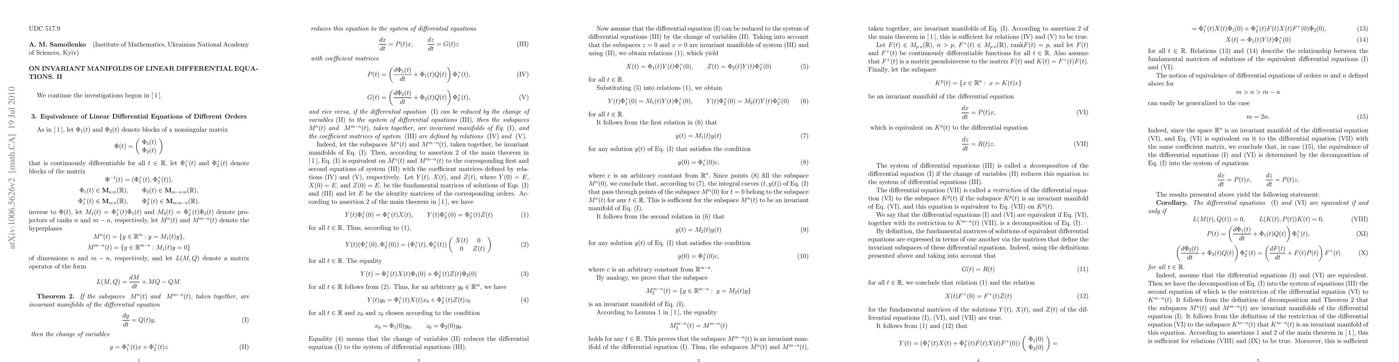 This is the continuation of previous article. For subspaces $M^n(t)$ and $M^{n-m}(t)$ which are invariant manifolds of the differential equation under consideration we build a change of variables which splits this equation into a system of two independent equations. A notion of equivalence of linear differential equations of different orders is introduced. Necessary and sufficient conditions of this equivalence are given. These results are applied to the Flocke-Lyapunov theory for linear equations with periodic coefficients with a period T. In the case when monodromy matrix of the equation has negative eigenvalues, thus reduction in $R^m$ to an equation with constant coeficcients is possible only with doubling of reduction matrix period, we prove the possibility of splitting off in $R^m$ of equations with negative eigenvalues of monodromy matrix with the help of a real matrix without period doubling. For the fundamental matrix of solutions of an equation with periodic coefficients $X(t), X(t)=E$, we find representation $X(t)=\Phi(t)e^{Ht}\Phi^{+}(0)$ with real rectangular matrices $H$ and $\Phi(t), \Phi(t)=\Phi(t+T)$. We bring two applications of these results: 1) reduction of nonlinear differential equation in $R^n$ with distinguished linear part which is periodic with period T to the equation in $R^m, m>n$, with a constiant matrix of coefficients of the linear part; 2) for introdusing of amplitude-phase coordinates in the neigbourhood of periodic orbit of autonomous differential equation with separation of the linear part with constant matrix of coefficients.