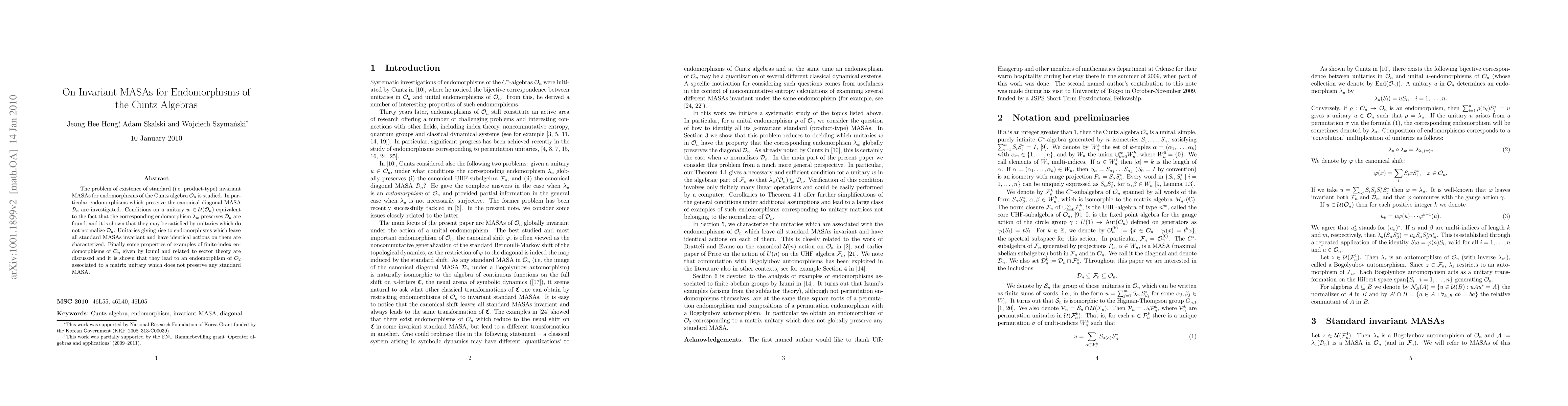 The problem of existence of standard (i.e. product-type) invariant MASAs for endomorphisms of the Cuntz algebra O_n is studied. In particular endomorphisms which preserve the canonical diagonal MASA D_n are investigated. Conditions on a unitary in O_n equivalent to the fact that the corresponding endomorphism preserves D_n are found, and it is shown that they may be satisfied by unitaries which do not normalize D_n. Unitaries giving rise to endomorphisms which leave all standard MASAs invariant and have identical actions on them are characterized. Finally some properties of examples of finite-index endomorphisms of O_n given by Izumi and related to sector theory are discussed and it is shown that they lead to an endomorphism of O_2 associated to a matrix unitary which does not preserve any standard MASA.