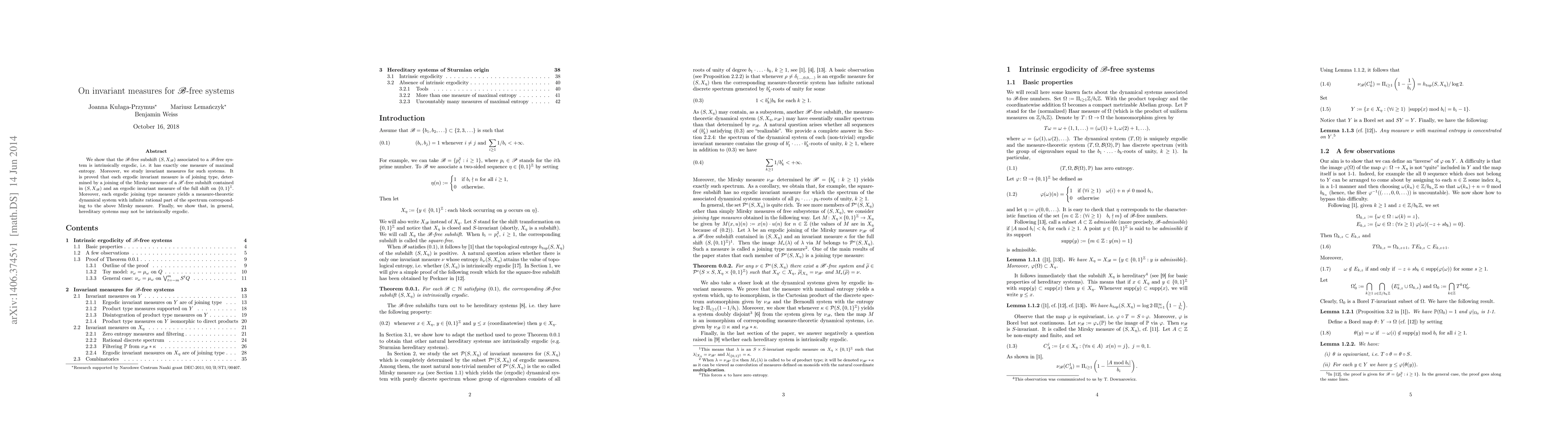 We show that the $\mathscr{B}$-free subshift $(S,X_{\mathscr{B}})$ associated to a $\mathscr{B}$-free system is intrinsically ergodic, i.e.\ it has exactly one measure of maximal entropy. Moreover, we study invariant measures for such systems. It is proved that each ergodic invariant measure is of joining type, determined by a joining of the Mirsky measure of a $\mathscr{B}'$-free subshift contained in $(S,X_{\mathscr{B}})$ and an ergodic invariant measure of the full shift on $\{0,1\}^{\mathbb{Z}}$. Moreover, each ergodic joining type measure yields a measure-theoretic dynamical system with infinite rational part of the spectrum corresponding to the above Mirsky measure. Finally, we show that, in general, hereditary systems may not be intrinsically ergodic.
