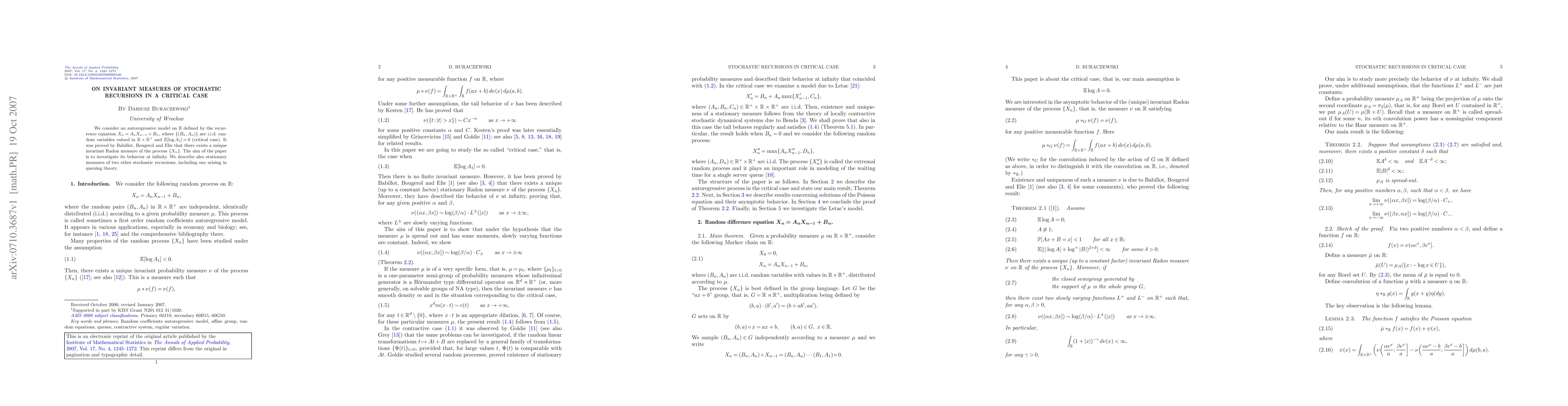 This paper investigates the behavior of an invariant Radon measure in a critical stochastic recursion with autoregressive model, focusing on its convergence at infinity. It also explores related stationary measures of other stochastic recursions.