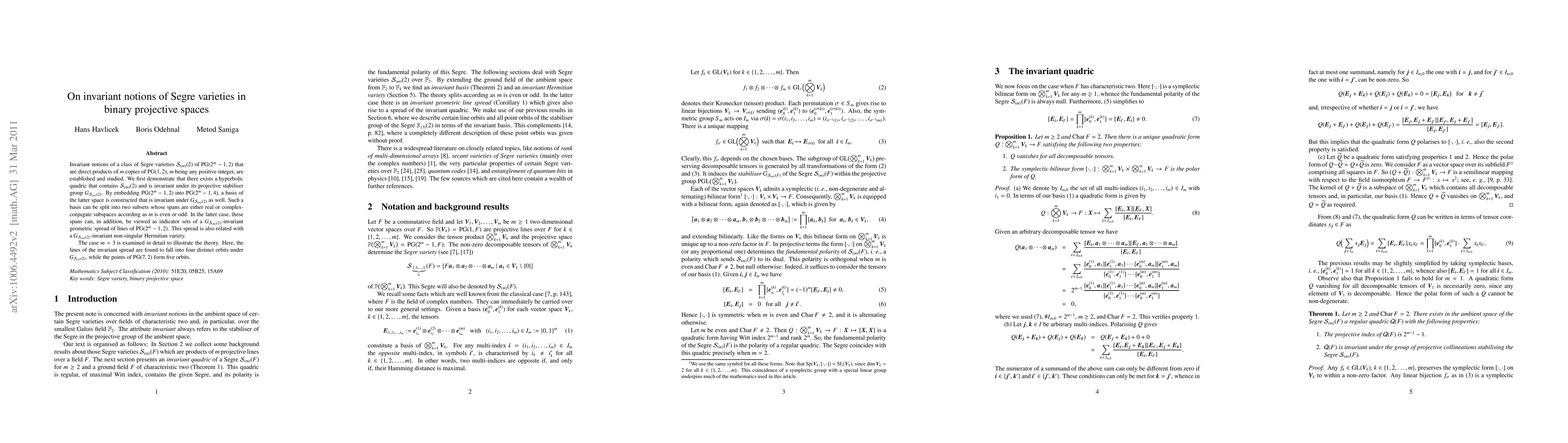 Invariant notions of a class of Segre varieties $\Segrem(2)$ of PG(2^m - 1, 2) that are direct products of $m$ copies of PG(1, 2), $m$ being any positive integer, are established and studied. We first demonstrate that there exists a hyperbolic quadric that contains $\Segrem(2)$ and is invariant under its projective stabiliser group $\Stab{m}{2}$. By embedding PG(2^m - 1, 2) into \PG(2^m - 1, 4), a basis of the latter space is constructed that is invariant under $\Stab{m}{2}$ as well. Such a basis can be split into two subsets whose spans are either real or complex-conjugate subspaces according as $m$ is even or odd. In the latter case, these spans can, in addition, be viewed as indicator sets of a $\Stab{m}{2}$-invariant geometric spread of lines of PG(2^m - 1, 2). This spread is also related with a $\Stab{m}{2}$-invariant non-singular Hermitian variety. The case $m=3$ is examined in detail to illustrate the theory. Here, the lines of the invariant spread are found to fall into four distinct orbits under $\Stab{3}{2}$, while the points of PG(7, 2) form five orbits.