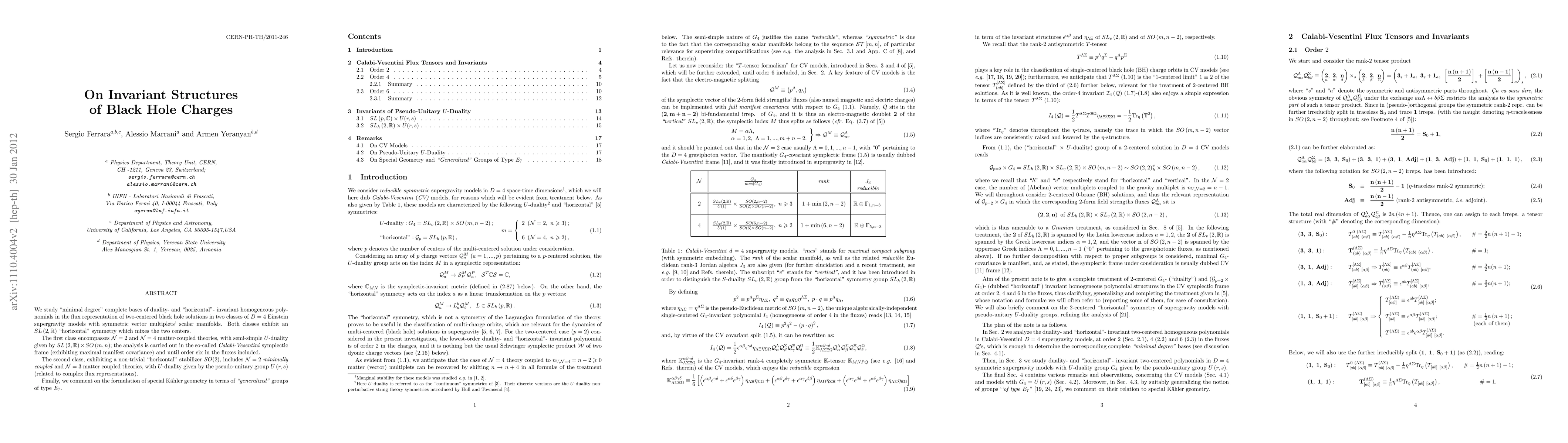 We study "minimal degree" complete bases of duality- and "horizontal"- invariant homogeneous polynomials in the flux representation of two-centered black hole solutions in two classes of D=4 Einstein supergravity models with symmetric vector multiplets' scalar manifolds. Both classes exhibit an SL(2,R) "horizontal" symmetry. The first class encompasses N=2 and N=4 matter-coupled theories, with semi-simple U-duality given by SL(2,R) x SO(m,n); the analysis is carried out in the so-called Calabi-Vesentini symplectic frame (exhibiting maximal manifest covariance) and until order six in the fluxes included. The second class, exhibiting a non-trivial "horizontal" stabilizer SO(2), includes N=2 minimally coupled and N=3 matter coupled theories, with U-duality given by the pseudo-unitary group U(r,s) (related to complex flux representations). Finally, we comment on the formulation of special Kaehler geometry in terms of "generalized" groups of type E7.