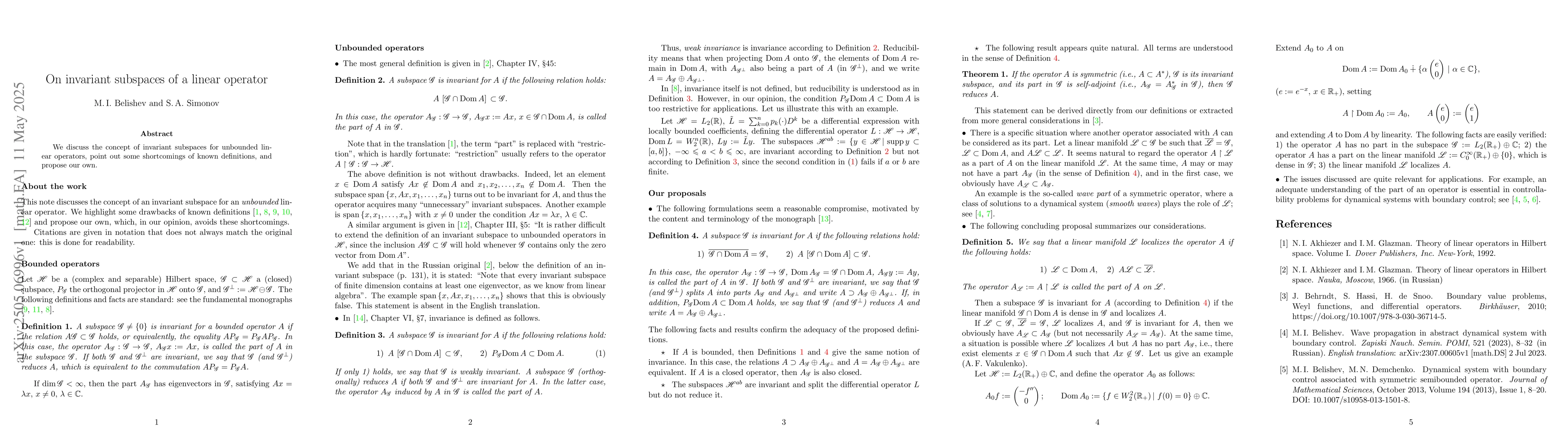 The paper discusses the concept of invariant subspaces for unbounded linear operators, identifying shortcomings in existing definitions and proposing an alternative.