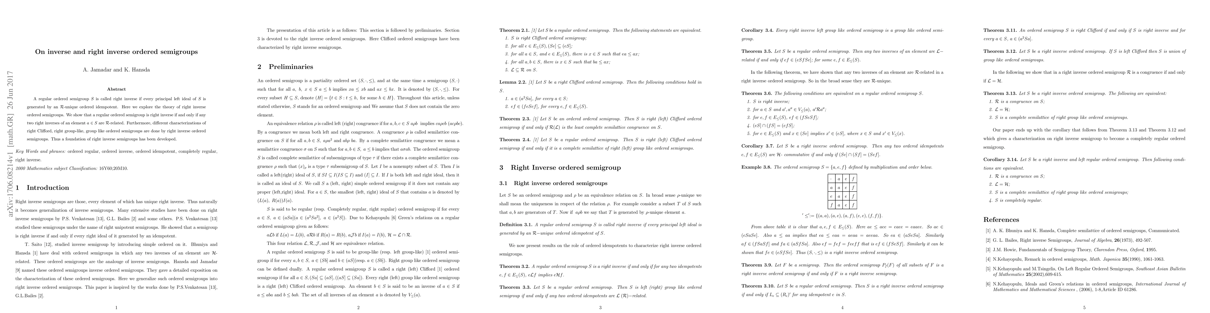 This paper explores the theory of right inverse ordered semigroups, proving that a regular ordered semigroup is right inverse if any two right inverses of an element are $\mathcal{R}$-related. It also characterizes various types of ordered semigroups through the lens of right inverse properties.