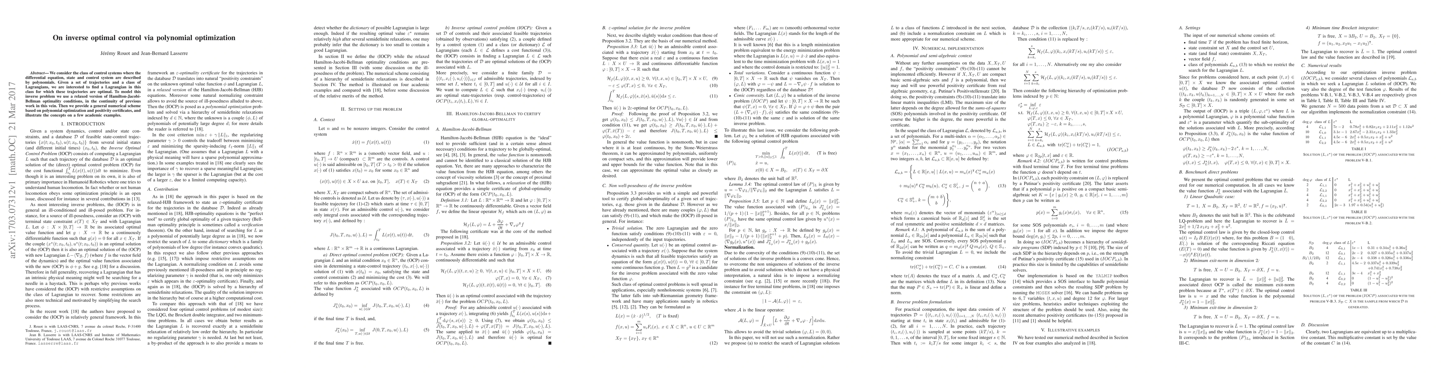 We consider the class of control systems where the differential equation, state and control system are described by polynomials. Given a set of trajectories and a class of Lagrangians, we are interested to find a Lagrangian in this class for which these trajectories are optimal. To model this inverse problem we use a relaxed version of Hamilton-Jacobi-Bellman optimality conditions, in the continuity of previous work in this vein. Then we provide a general numerical scheme based on polynomial optimization and positivity certificates, and illustrate the concepts on a few academic examples.