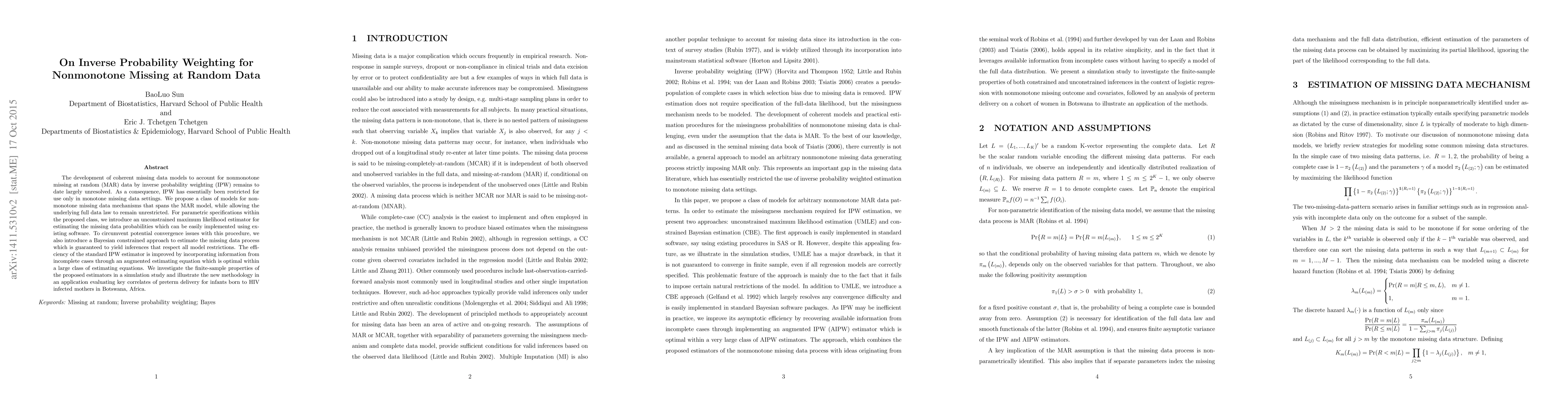 The development of coherent missing data models to account for nonmonotone missing at random (MAR) data by inverse probability weighting (IPW) remains to date largely unresolved. As a consequence, IPW has essentially been restricted for use only in monotone missing data settings. We propose a class of models for nonmonotone missing data mechanisms that spans the MAR model, while allowing the underlying full data law to remain unrestricted. For parametric specifications within the proposed class, we introduce an unconstrained maximum likelihood estimator for estimating the missing data probabilities which can be easily implemented using existing software. To circumvent potential convergence issues with this procedure, we also introduce a Bayesian constrained approach to estimate the missing data process which is guaranteed to yield inferences that respect all model restrictions. The efficiency of the standard IPW estimator is improved by incorporating information from incomplete cases through an augmented estimating equation which is optimal within a large class of estimating equations. We investigate the finite-sample properties of the proposed estimators in a simulation study and illustrate the new methodology in an application evaluating key correlates of preterm delivery for infants born to HIV infected mothers in Botswana, Africa.