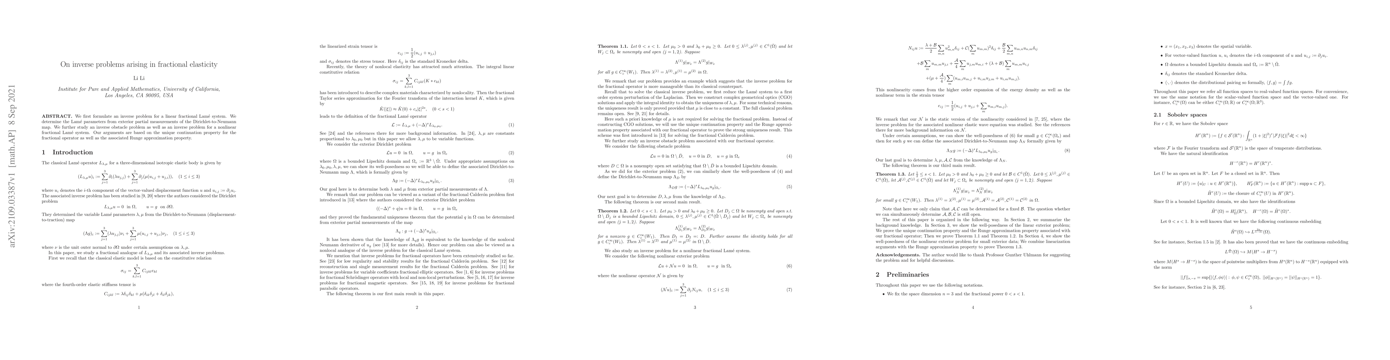 We first formulate an inverse problem for a linear fractional Lam\'e system. We determine the Lam\'e parameters from exterior partial measurements of the Dirichlet-to-Neumann map. We further study an inverse obstacle problem as well as an inverse problem for a nonlinear fractional Lam\'e system. Our arguments are based on the unique continuation property for the fractional operator as well as the associated Runge approximation property.