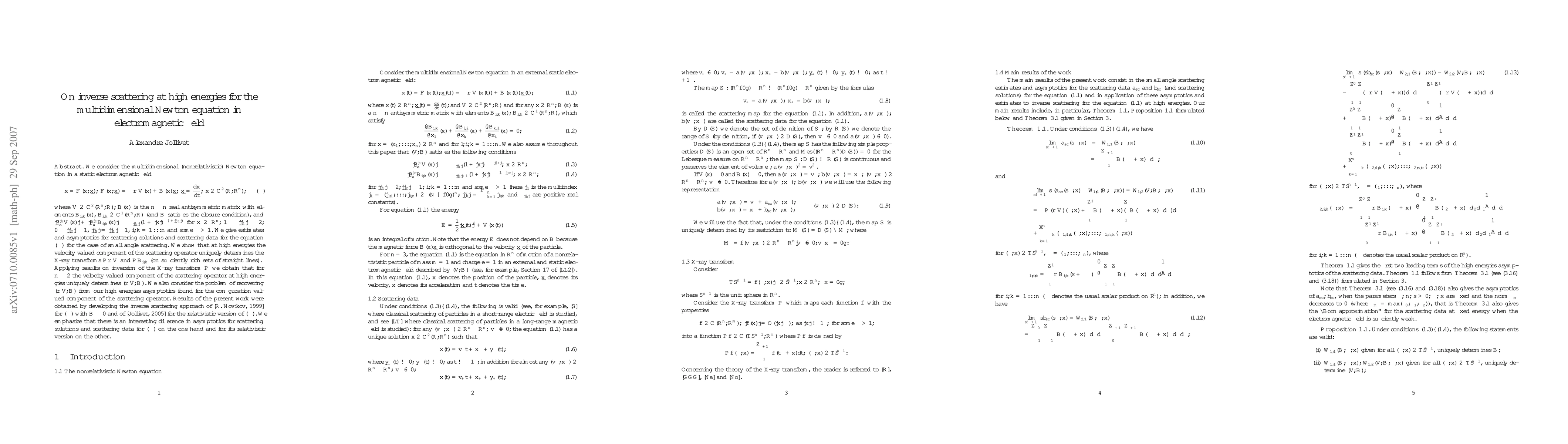 We consider the multidimensional (nonrelativistic) Newton equation in a static electromagnetic field $$\ddot x = F(x,\dot x), F(x,\dot x)=-\nabla V(x)+B(x)\dot x, \dot x={dx\over dt}, x\in C^2(\R,\R^n),\eqno{(*)}$$ where $V \in C^2(\R^n,\R),$ $B(x)$ is the $n\times n$ real antisymmetric matrix with elements $B_{i,k}(x)$, $B_{i,k}\in C^1(\R^n,\R)$ (and $B$ satisfies the closure condition), and $|\pa^{j_1}_xV(x)| +|\pa^{j_2}_xB_{i,k}(x)| \le \beta_{|j_1|} (1+|x|)^{-(\alpha+|j_1|)}$ for $x\in \R^n,$ $1\le|j_1|\le 2,$ $0\le|j_2|\le 1$, $|j_2|=|j_1|-1$, $i,k=1... n$ and some $\alpha > 1$. We give estimates and asymptotics for scattering solutions and scattering data for the equation $(*)$ for the case of small angle scattering. We show that at high energies the velocity valued component of the scattering operator uniquely determines the X-ray transforms $P\nabla V$ and $PB_{i,k}$ (on sufficiently rich sets of straight lines). Applying results on inversion of the X-ray transform $P$ we obtain that for $n\ge 2$ the velocity valued component of the scattering operator at high energies uniquely determines $(\nabla V,B)$. We also consider the problem of recovering $(\nabla V,B)$ from our high energies asymptotics found for the configuration valued component of the scattering operator. Results of the present work were obtained by developing the inverse scattering approach of [R. Novikov, 1999] for $(*)$ with $B\equiv 0$ and of [Jollivet, 2005] for the relativistic version of $(*)$. We emphasize that there is an interesting difference in asymptotics for scattering solutions and scattering data for $(*)$ on the one hand and for its relativistic version on the other.