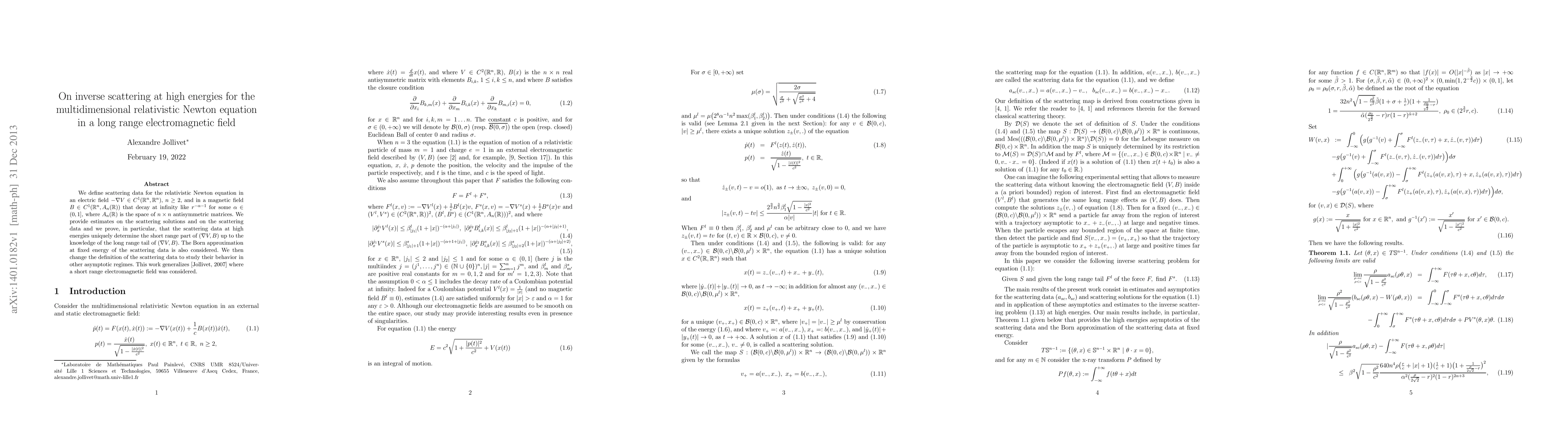 We define scattering data for the relativistic Newton equation in an electric field $-\nabla V\in C^1(\R^n,\R^n)$, $n\ge 2$, and in a magnetic field $B\in C^1(\R^n,A_n(\R))$ that decay at infinity like $r^{-\alpha-1}$ for some $\alpha\in (0,1]$, where $A_n(\R)$ is the space of $n\times n$ antisymmetric matrices. We provide estimates on the scattering solutions and on the scattering data and we prove, in particular, that the scattering data at high energies uniquely determine the short range part of $(\nabla V,B)$ up to the knowledge of the long range tail of $(\nabla V,B)$. The Born approximation at fixed energy of the scattering data is also considered. We then change the definition of the scattering data to study their behavior in other asymptotic regimes. This work generalizes [Jollivet, 2007] where a short range electromagnetic field was considered.