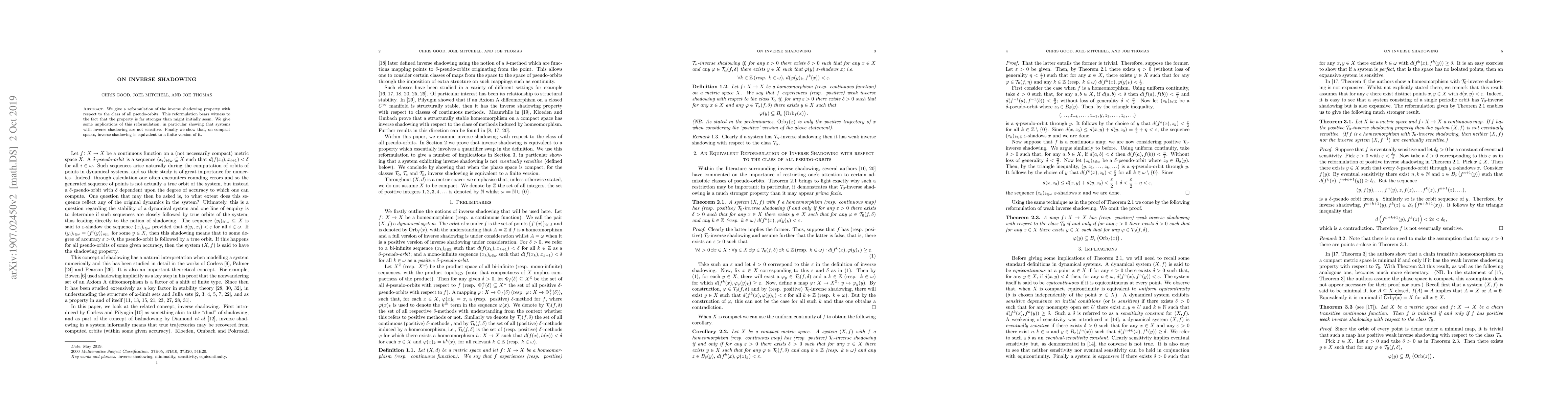 This paper reformulates the inverse shadowing property concerning all pseudo-orbits, demonstrating its greater strength. It concludes that systems with inverse shadowing are not sensitive and shows that inverse shadowing on compact spaces is equivalent to its finite version.