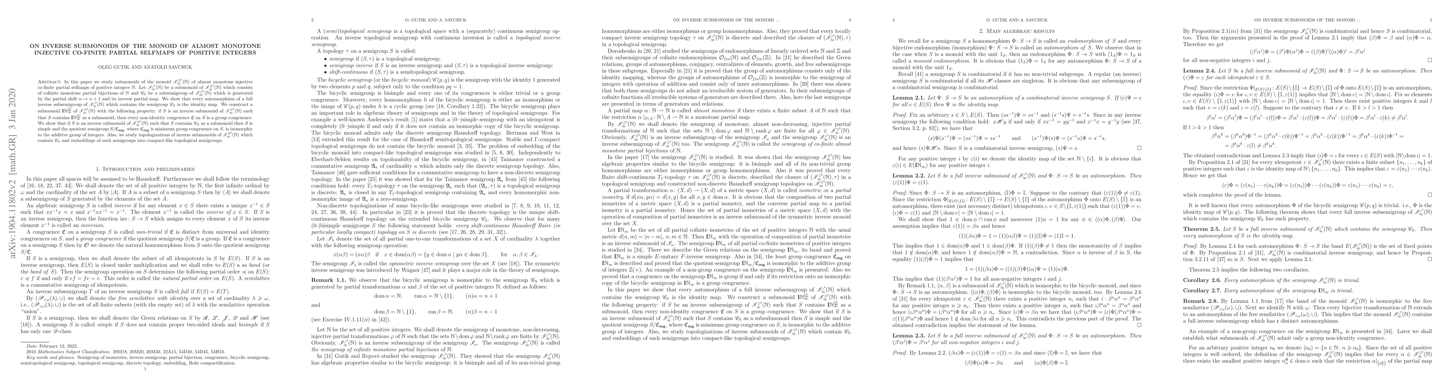 In this paper we study submonoids of the monoid $\mathscr{I}_\infty^{\,\Rsh\!\!\!\nearrow}(\mathbb{N})$ of almost monotone injective co-finite partial selfmaps of positive integers $\mathbb{N}$. Let $\mathscr{I}_\infty^{\!\nearrow}(\mathbb{N})$ be a submonoid of $\mathscr{I}_\infty^{\,\Rsh\!\!\!\nearrow}(\mathbb{N})$ which consists of cofinite monotone partial bijections of $\mathbb{N}$ and $\mathscr{C}_{\mathbb{N}}$ be a subsemigroup $\mathscr{I}_\infty^{\,\Rsh\!\!\!\nearrow}(\mathbb{N})$ which is generated by the partial shift $n\mapsto n+1$ and its inverse partial map. We show that every automorphism of a full inverse subsemigroup of $\mathscr{I}_\infty^{\!\nearrow}(\mathbb{N})$ which contains the semigroup $\mathscr{C}_{\mathbb{N}}$ is the identity map. We construct a submonoid $\mathbf{I}\mathbb{N}_\infty^{[\underline{1}]}$ of $\mathscr{I}_\infty^{\,\Rsh\!\!\!\nearrow}(\mathbb{N})$ with the following property: if $S$ is an inverse submonoid of $\mathscr{I}_\infty^{\,\Rsh\!\!\!\nearrow}(\mathbb{N})$ such that $S$ contains $\mathbf{I}\mathbb{N}_\infty^{[\underline{1}]}$ as a submonoid, then every non-identity congruence $\mathfrak{C}$ on $S$ is a group congruence. We show that if $S$ is an inverse submonoid of $\mathscr{I}_\infty^{\,\Rsh\!\!\!\nearrow}(\mathbb{N})$ such that $S$ contains $\mathscr{C}_{\mathbb{N}}$ as a submonoid then $S$ is simple and the quotient semigroup $S/\mathfrak{C}_{\mathbf{mg}}$, where $\mathfrak{C}_{\mathbf{mg}}$ is minimum group congruence on $S$, is isomorphic to the additive group of integers. Also, we study topologizations of inverse submonoids of $\mathscr{I}_\infty^{\,\Rsh\!\!\!\nearrow}(\mathbb{N})$ which contain $\mathscr{C}_{\mathbb{N}}$ and embeddings of such semigroups into compact-like topological semigroups.