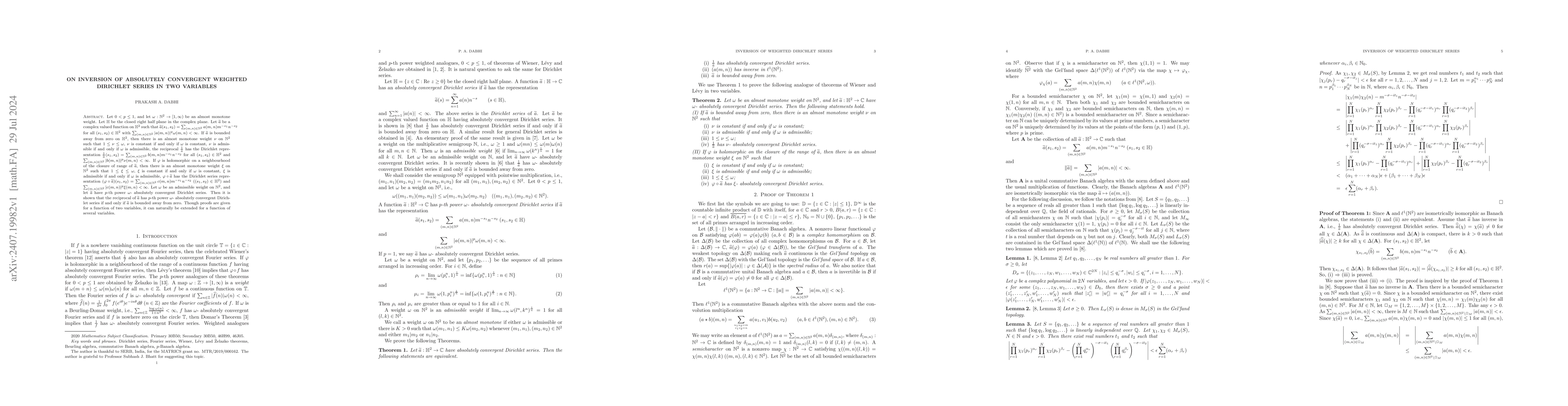The paper explores the inversion of absolutely convergent weighted Dirichlet series in two variables under certain conditions, showing that if a series is bounded away from zero, its reciprocal also has an absolutely convergent series representation. Additionally, it discusses how holomorphic functions applied to such series maintain their series representation properties.