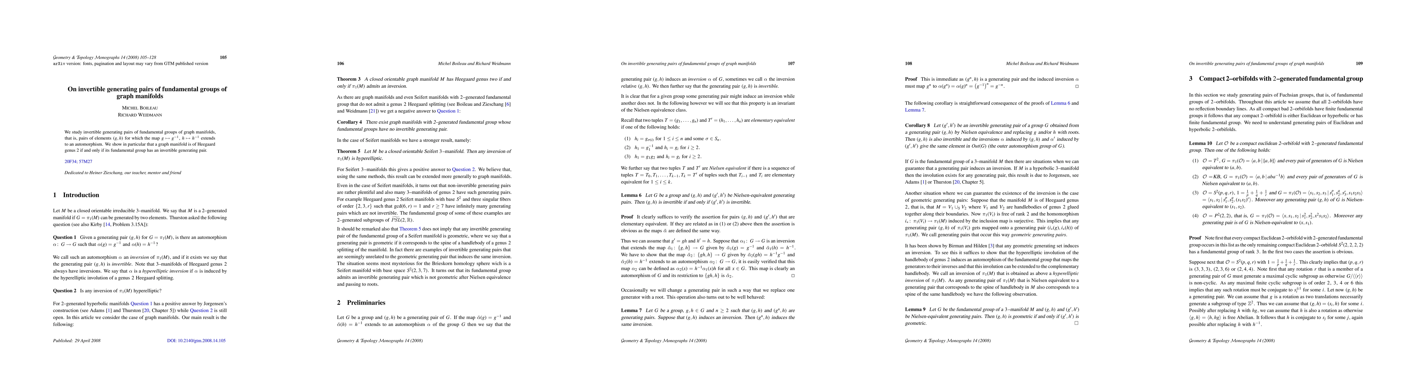 We study invertible generating pairs of fundamental groups of graph manifolds, that is, pairs of elements (g,h) for which the map g --> g^{-1}, h --> h^{-1} extends to an automorphism. We show in particular that a graph manifold is of Heegaard genus 2 if and only if its fundamental group has an invertible generating pair.