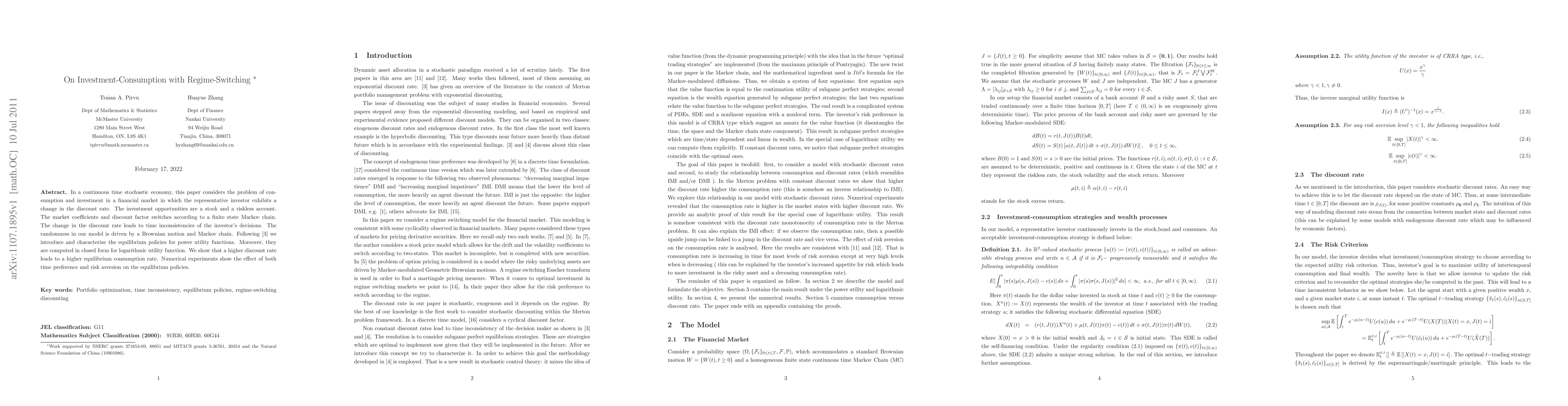 In a continuous time stochastic economy, this paper considers the problem of consumption and investment in a financial market in which the representative investor exhibits a change in the discount rate. The investment opportunities are a stock and a riskless account. The market coefficients and discount factor switches according to a finite state Markov chain. The change in the discount rate leads to time inconsistencies of the investor's decisions. The randomness in our model is driven by a Brownian motion and Markov chain. Following Ekeland etc (2008) we introduce and characterize the equilibrium policies for power utility functions. Moreover, they are computed in closed form for logarithmic utility function. We show that a higher discount rate leads to a higher equilibrium consumption rate. Numerical experiments show the effect of both time preference and risk aversion on the equilibrium policies.