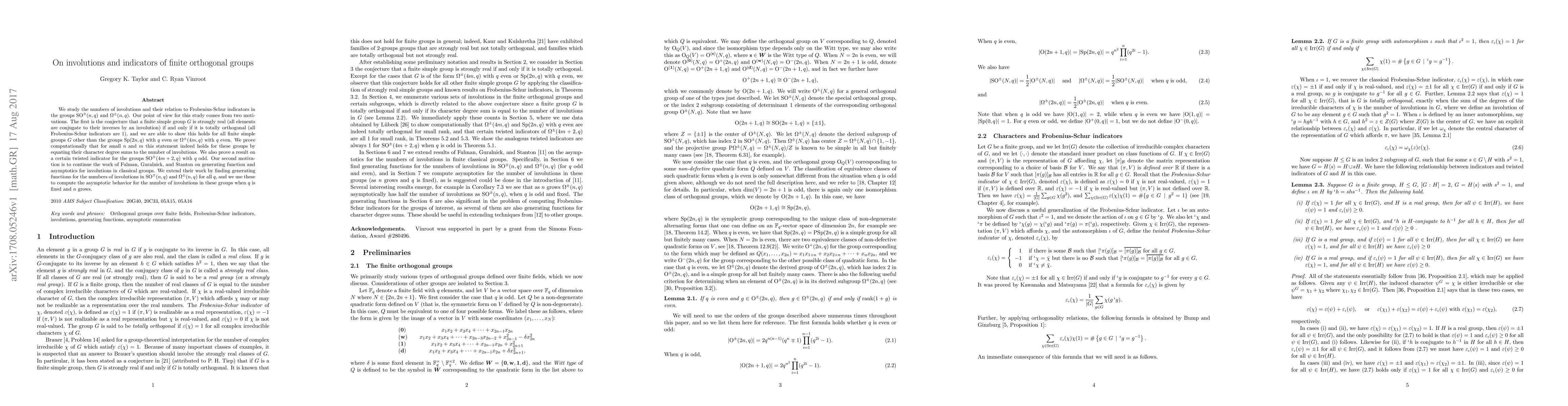 This paper investigates the relationship between involutions and Frobenius-Schur indicators in finite orthogonal groups $\mathrm{SO}^{\pm}(n,q)$ and $\Omega^{\pm}(n,q)$. It proves the conjecture that a finite simple group $G$ is strongly real if and only if it is totally orthogonal, except for specific symplectic and odd-order orthogonal groups, and extends generating functions for involutions in these groups to compute their asymptotic behavior.