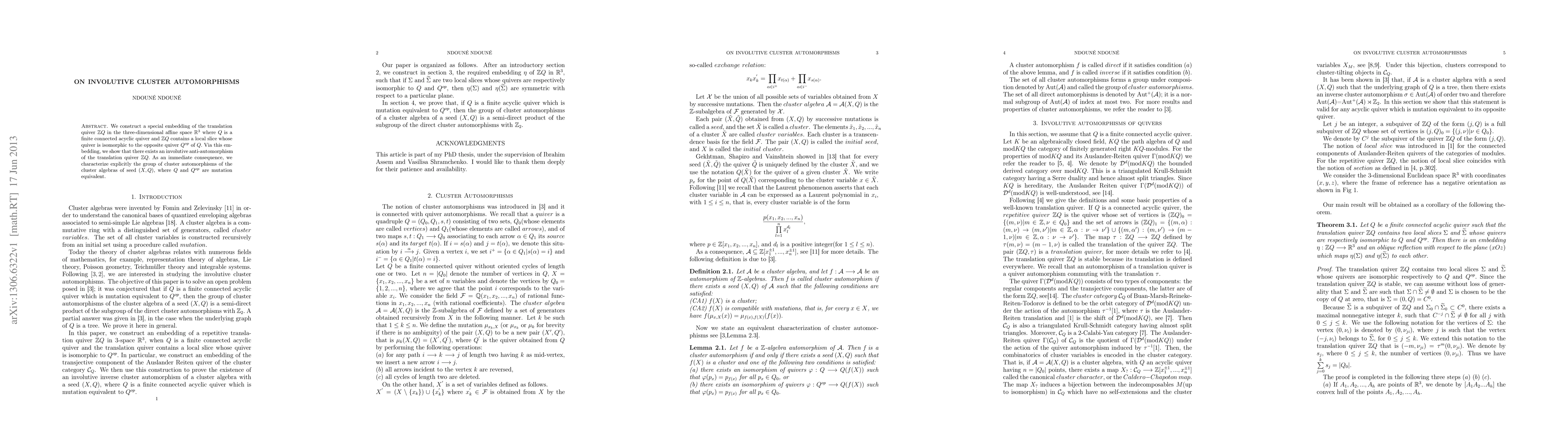 Researchers embed a quiver in 3D space to show that an involutive anti-automorphism exists for the translation quiver, which has implications for cluster algebras.
