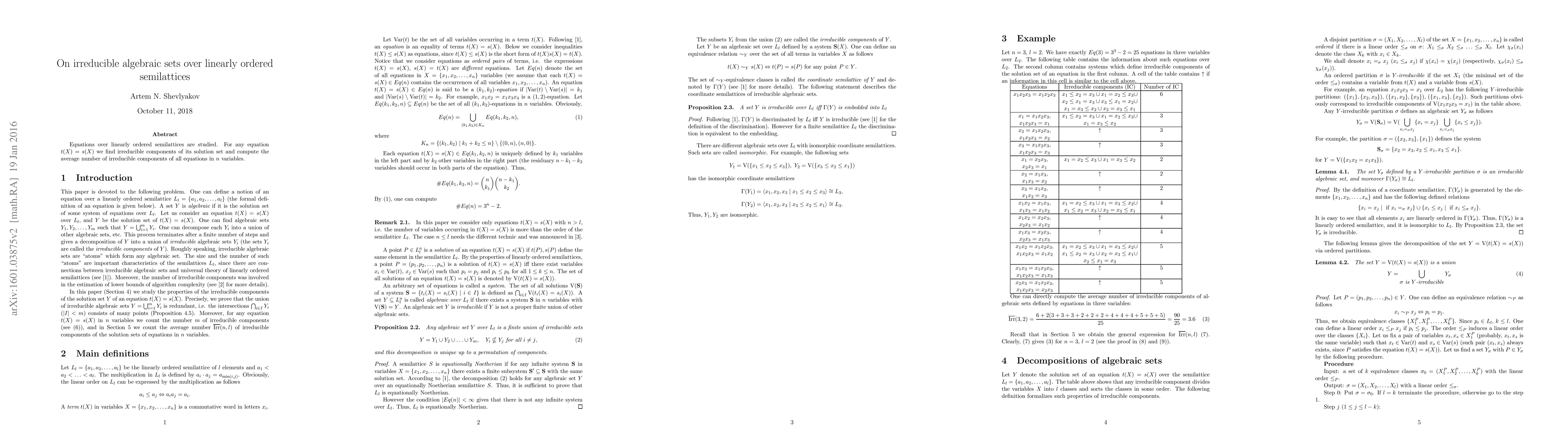 This research investigates equations over linearly ordered semilattices, identifying the irreducible components of their solution sets and determining the average number of such components for equations with $n$ variables.