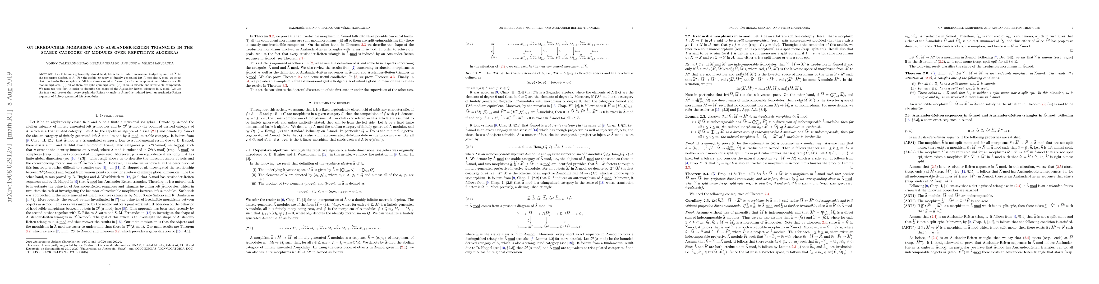 The paper studies irreducible morphisms in the stable category of finitely generated left modules over repetitive algebras, revealing three canonical forms for these morphisms, and describes the shape of Auslander-Reiten triangles using this information.