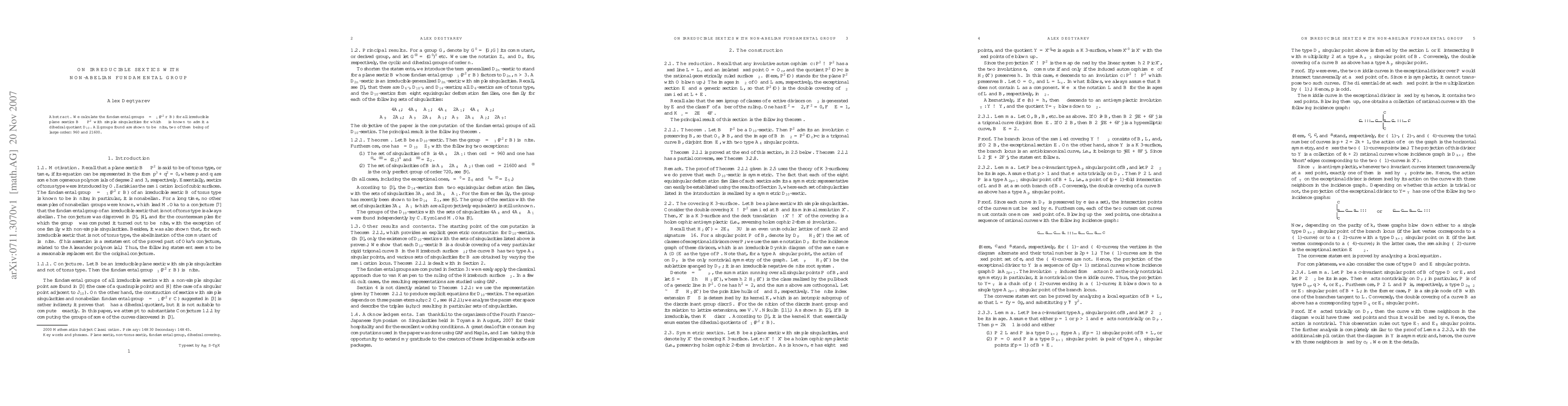 This study calculates the fundamental groups for irreducible plane sextics with simple singularities, finding that all groups are finite, with two notably large orders of 960 and 21600 when admitting a dihedral quotient $D_{10}$.