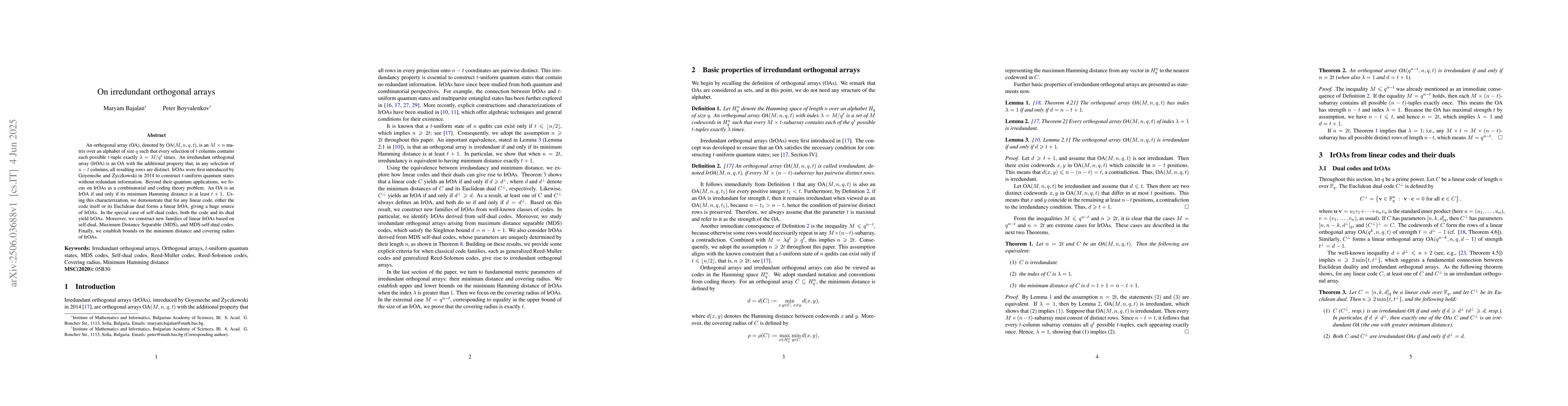 This work extends previous research by Goyeneche and Życzkowski by focusing on IrOAs as a combinatorial and coding theory problem, significantly expanding the known sources of IrOAs and providing novel distance and covering radius bounds.