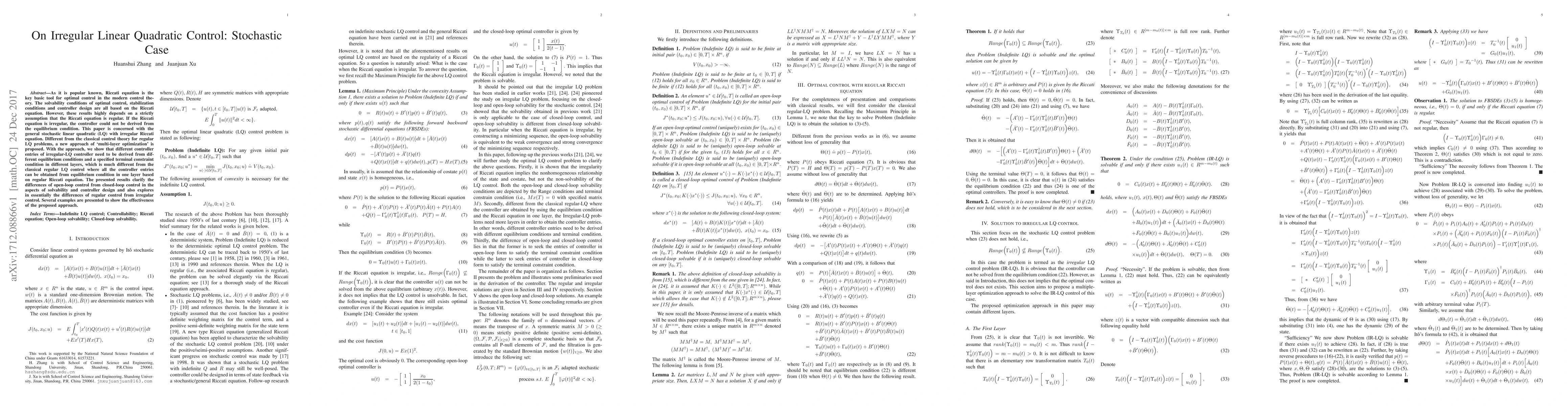 As it is popular known, Riccati equation is the key basic tool for optimal control in the modern control theory. The solvability conditions of optimal control, stabilization conditions and controller design are all based on the Riccati equation. However, these results highly depends on a strictly assumption that the Riccati equation is regular. If the Riccati equation is irregular, the controller could not be derived from the equilibrium condition. This paper is concerned with the general stochastic linear quadratic (LQ) with irregular Riccati equation. Different from the classical control theory for regular LQ problems, a new approach of `multi-layer optimization' is proposed. With the approach, we show that different controller entries of irregular-LQ controller need to be derived from different equilibrium conditions and a specified terminal constraint condition in different layers, which is much different from the classical regular LQ control where all the controller entries can be obtained from equilibrium condition in one layer based on regular Riccati equation. The presented results clarify the differences of open-loop control from closed-loop control in the aspects of solvability and controller design and also explores in essentially the differences of regular control from irregular control. Several examples are presented to show the effectiveness of the proposed approach.