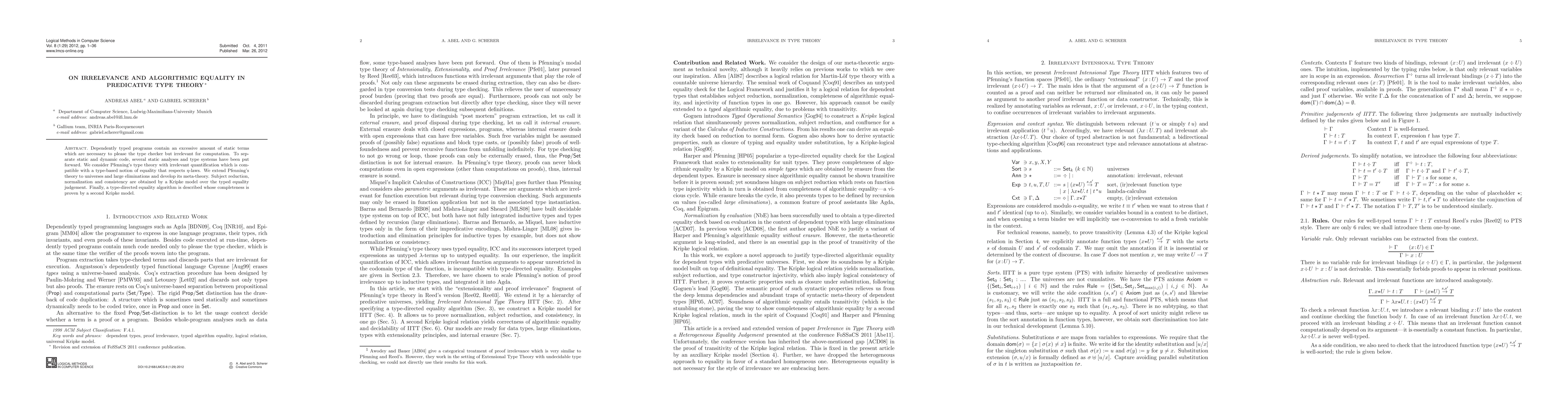 This paper extends Pfenning's type theory with irrelevant quantification to accommodate universes and large eliminations, and establishes its meta-theoretical properties through a Kripke model. It also presents a type-directed equality algorithm and proves its completeness using a second Kripke model.