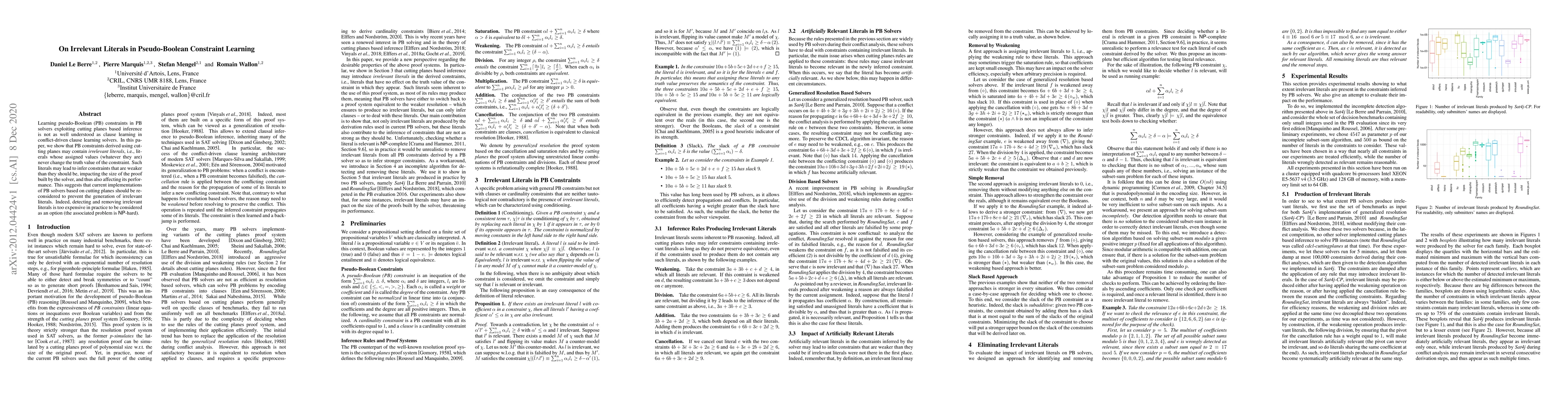 This paper investigates irrelevant literals in pseudo-Boolean constraints derived via cutting planes, revealing that such literals can weaken constraints and affect solver performance. It suggests reconsidering current PB solver implementations to mitigate the generation of these irrelevant literals, though detecting and removing them is computationally expensive.