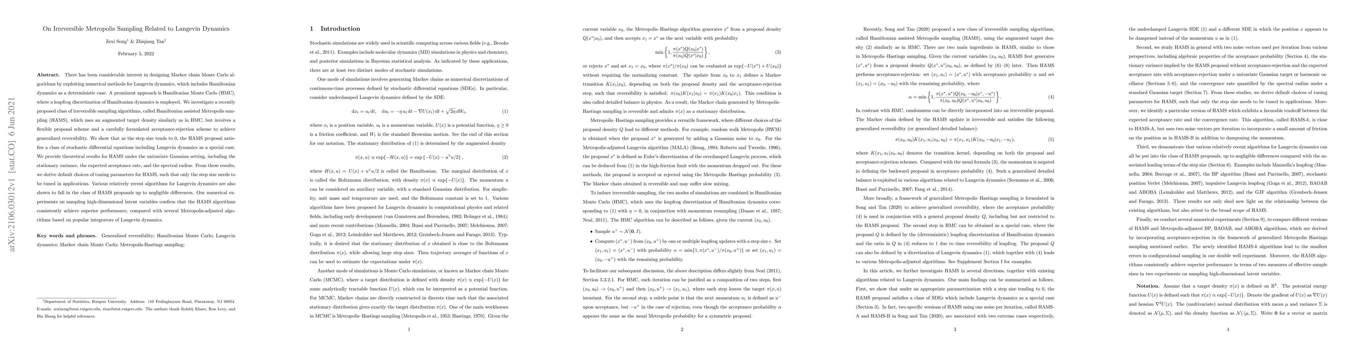 This paper investigates Hamiltonian assisted Metropolis sampling (HAMS), a novel irreversible Markov chain Monte Carlo method that leverages Langevin dynamics. The authors demonstrate that HAMS generalizes reversibility and outperforms other algorithms in sampling high-dimensional latent variables, providing theoretical insights and default parameter choices for practical applications.
