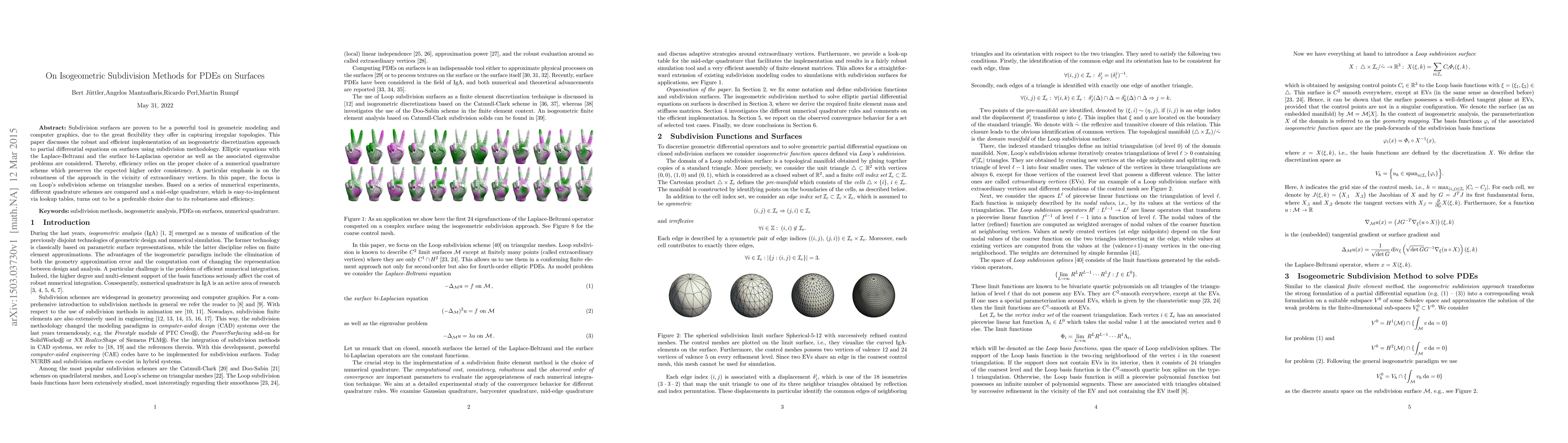 This paper explores the implementation of isogeometric subdivision methods for solving partial differential equations on surfaces, focusing on Loop's subdivision scheme for triangular meshes. It emphasizes the robustness of the approach near extraordinary vertices and finds that a mid-edge quadrature scheme is optimal for maintaining higher order consistency and efficiency.