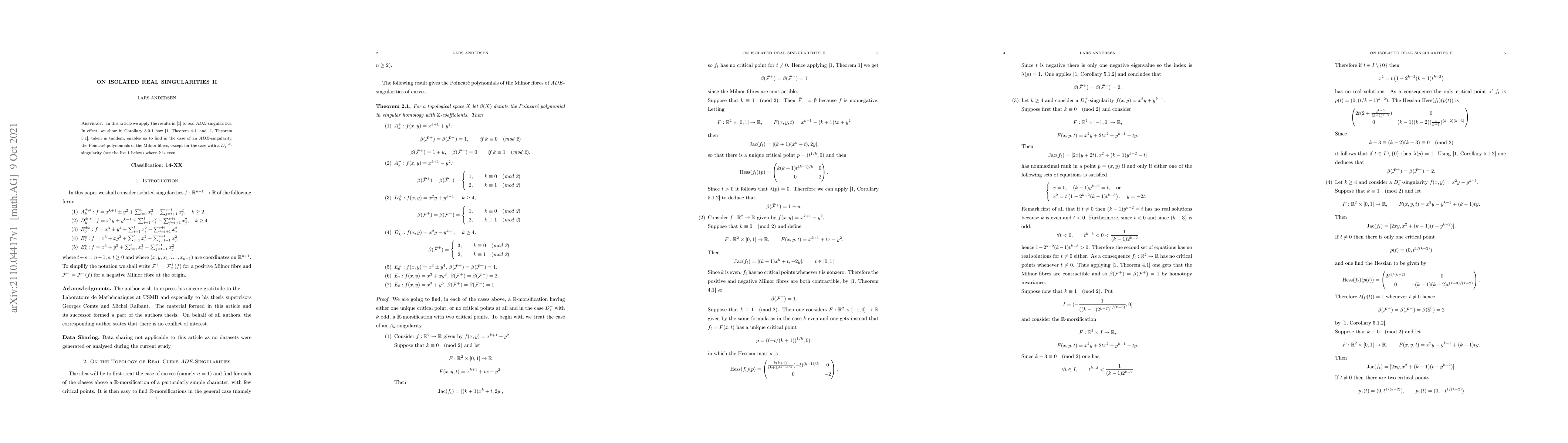 The paper applies results from 'On Isolated Real Singularities I' to study real ADE-singularities, determining the homology groups of Milnor fibers for real ADE-singularities of curves and extending this to higher codimension, except for D-k with even k and n ≥ 2.