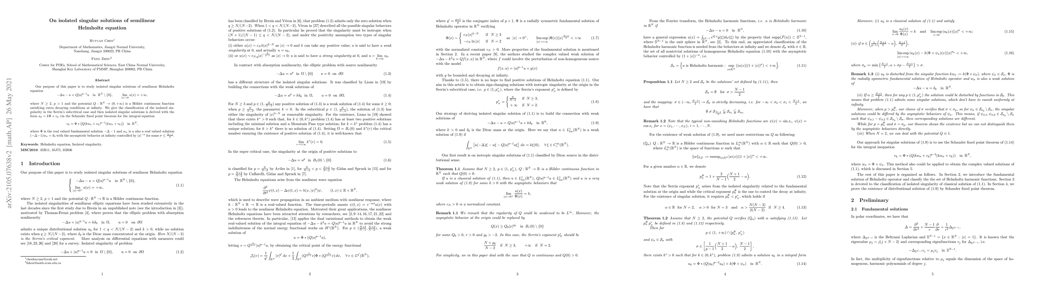This paper studies isolated singular solutions of a semilinear Helmholtz equation with a nonlinear potential Q, focusing on its classification in the subcritical case and deriving a solution form via the Schauder fixed point theorem.
