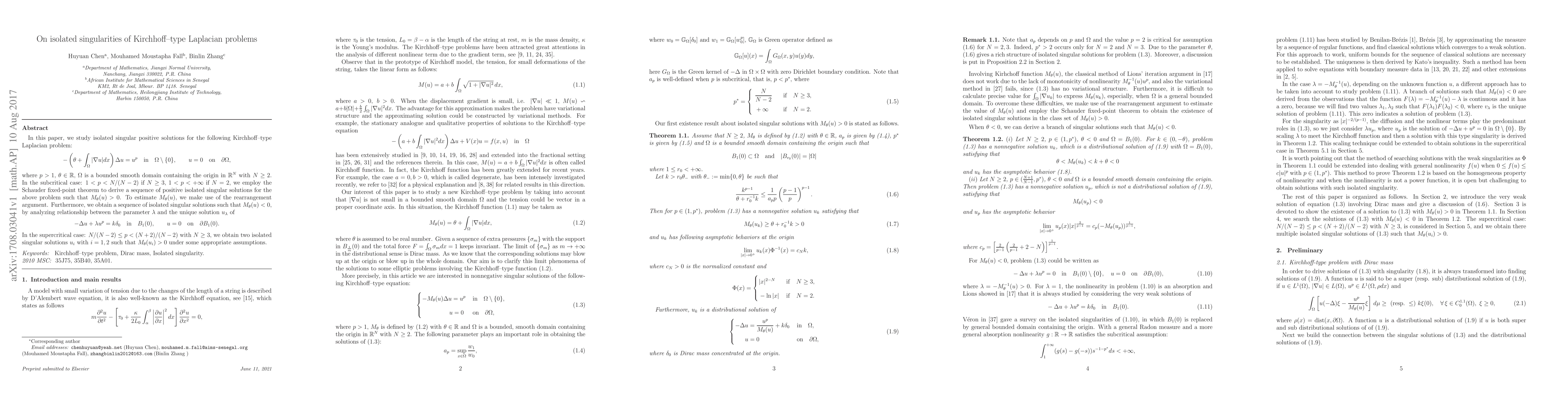 In this paper, we study isolated singular positive solutions for the following Kirchhoff--type Laplacian problem: \begin{equation*} -\left(\theta+\int_{\Omega} |\nabla u| dx\right)\Delta u =u^p \quad{\rm in}\quad \Omega\setminus \{0\},\qquad u=0\quad {\rm on}\quad \partial \Omega, \end{equation*} where $p>1$, $\theta\in \R$, $\Omega$ is a bounded smooth domain containing the origin in $\R^N$ with $N\ge 2$. In the subcritical case: $1